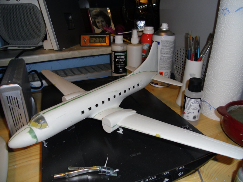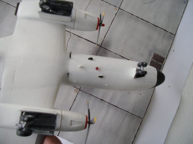 Bei diesem Modell ist es zwingend notwendig alles zu grundieren, um die Unebenheiten zu erkennen und zu beseitigen. Danach wird das gesamte Modell weiß gespritzt. Ich hatte mit weißer Farbe auf weißem Unter-grund so meine Schwierigkeiten. Blau für die Fensterstreifen, Rot für die Warnstellen und Schwarz für die Rumpfspitze und den Blendschutz vor dem Cockpit.