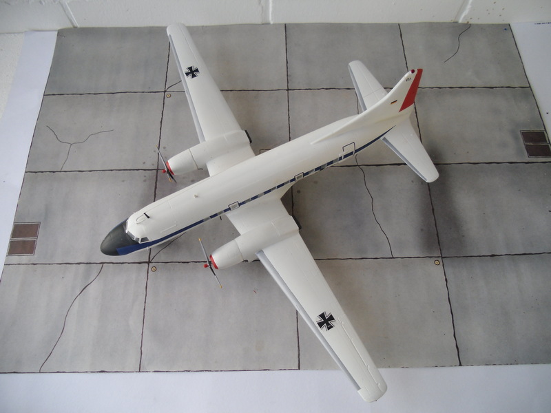 Die Farbgebung war weiß über alles, nur mit einer blauen Seitenlinie über die Fensterreihe und ohne den Schriftzug Luftwaffe. Dazu noch der Tagessichtschutz in Gelborange bzw. Rot am Seitenruder und an der Vorderkante der Motoren und an den Tragflächenspitzen.