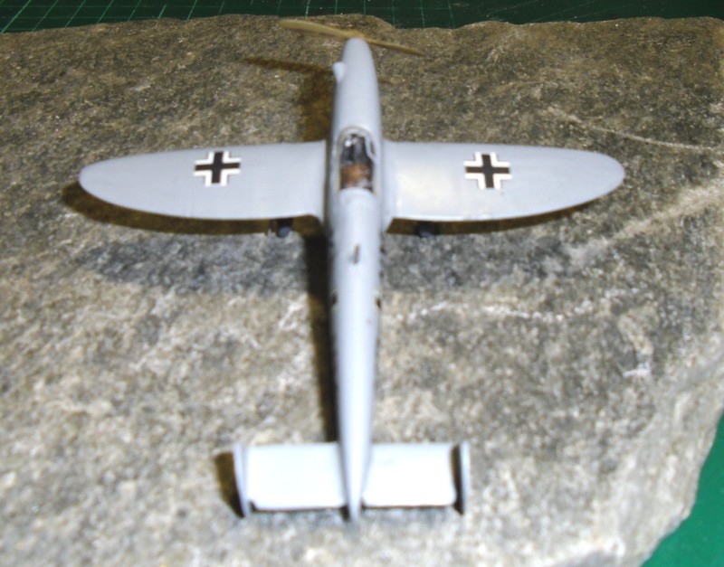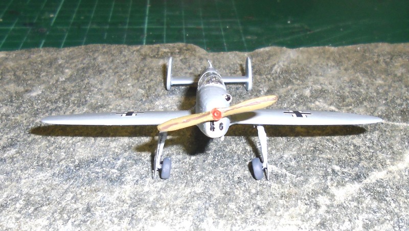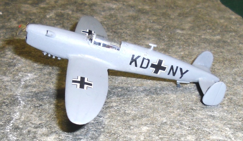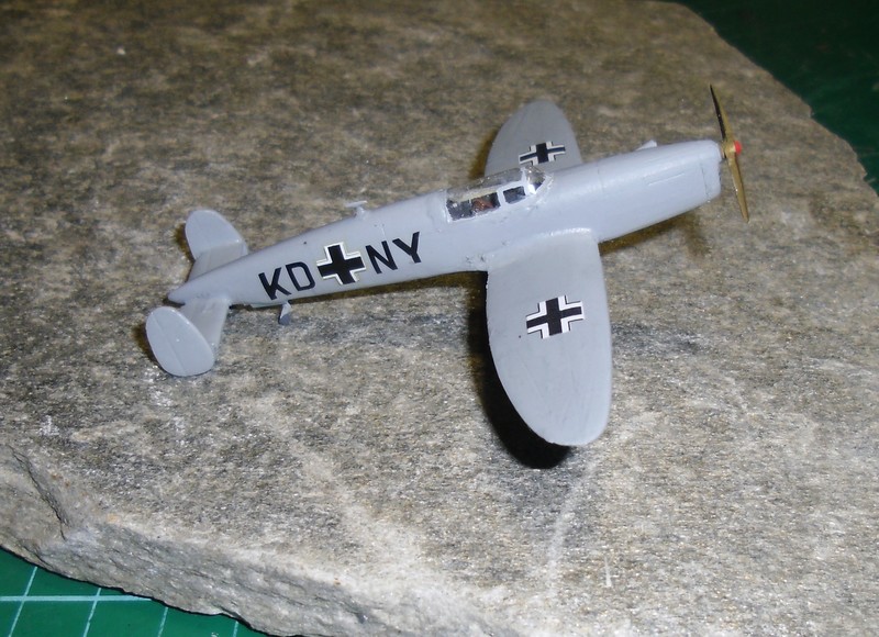 Große Schwierigkeiten hatte ich mit der tiefgezogenen Kanzelabdeckung. Das ganze war so instabil und saß erst nach mehreren Versuchen und sieht noch immer nicht gut aus. Am Motor links oben kam noch eine Hutze. Gespritzt wurde das Modell mit Hellgrau, die Decals kamen aus der Grabbelkiste.