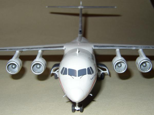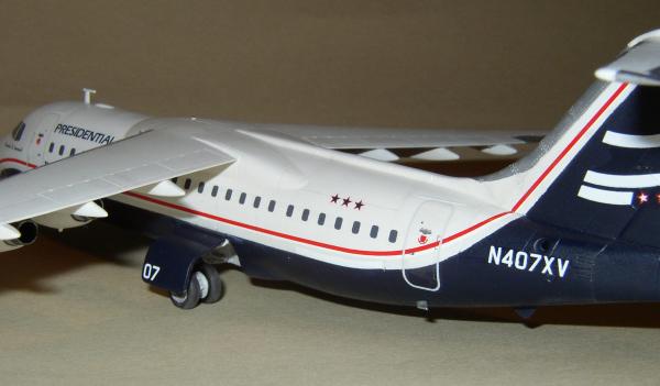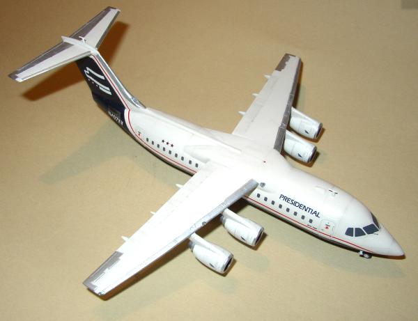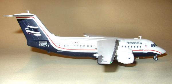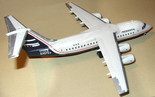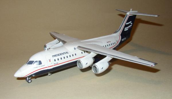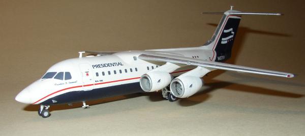 Das Modell stellt eine Maschine der ehemaligen amerikanischen Fluggesellschaft "PRESIDENTIAL" dar, die schon 1986 in den Konkurs ging. Die Decals stammen von "Livenes Unlimited" aus den USA. Für die Bemalung wurden Humbrol - Farben weiß und blau benutzt. Gealtert wurde wieder mit Kreidepulver. Die Positionslampen sind aus klarem Plastik selbst hergestellt worden.