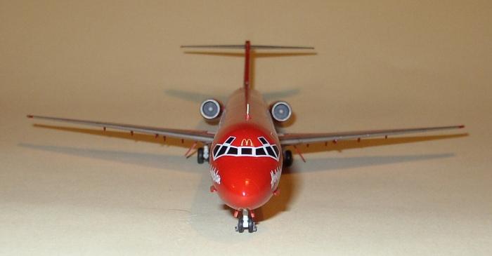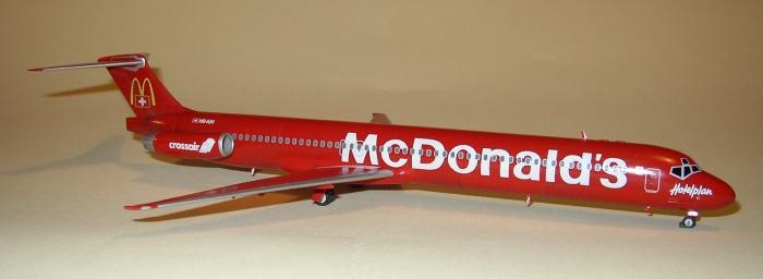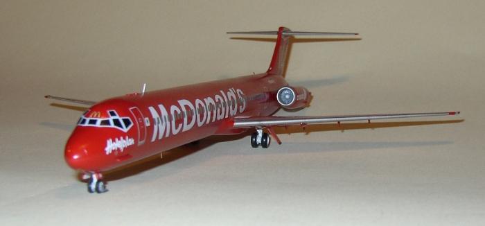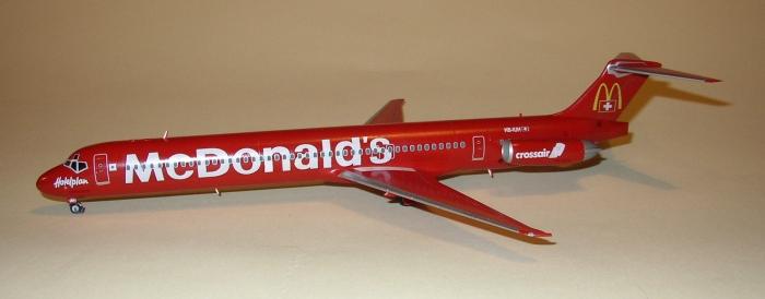 Die MD-80 ist einer der besten Zivilflugzeug-Bausätze, die Minicraft herstellt. Alle Bausatzteile passen sehr gut zusammen. Nach dem Bau habe ich das Modell mit grauer Autogrundierung angesprüht. Das Flugzeug wurde mit Humbrol 19 (Rot) lackiert. Die Flügelvorderkanten sind Humbrol "Metalcote", welches mit dem Pinsel aufgetragen wurde. Die Decals sind "Draw Decals" für Crossair Sonderbemalung "McDonalds". Diese sind "ALPS printed" und dadurch sehr durchscheinend, d.h. die weißen Decals mussten doppelt aufgetragen werden.
