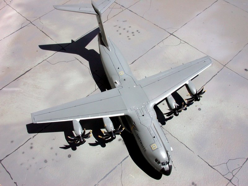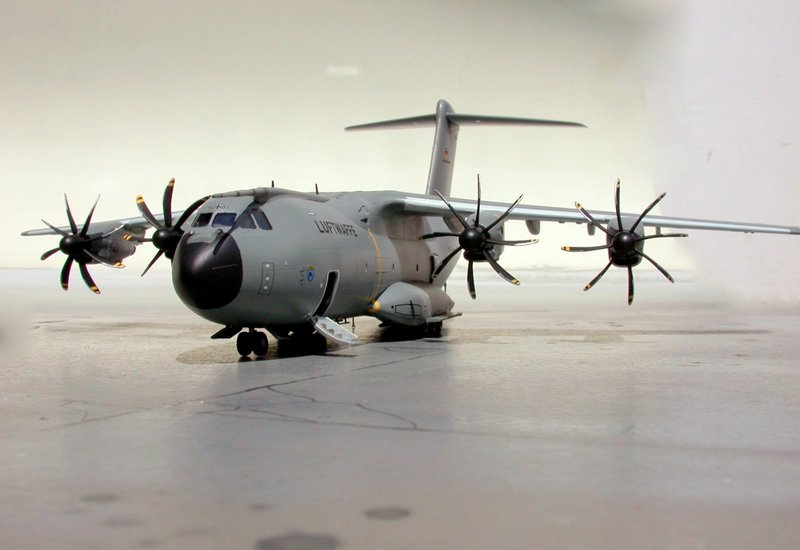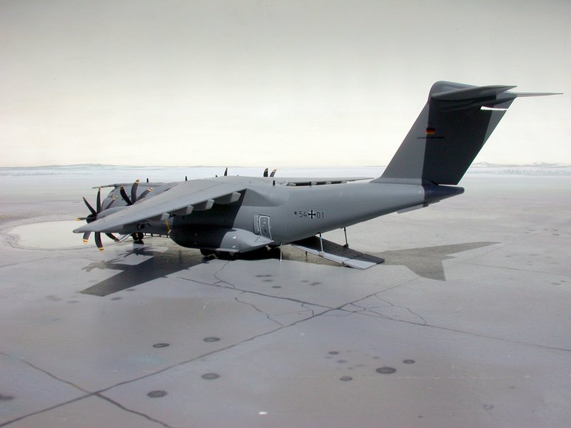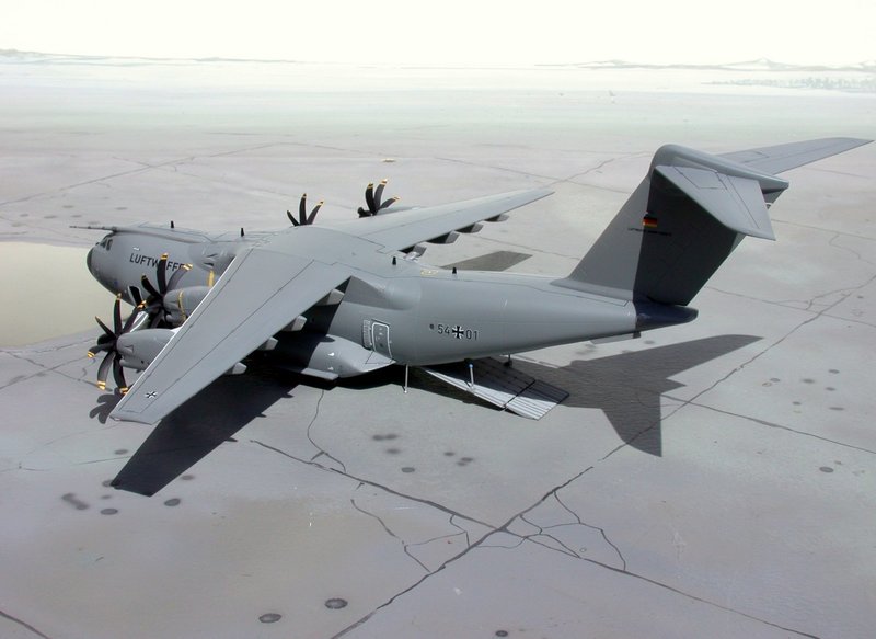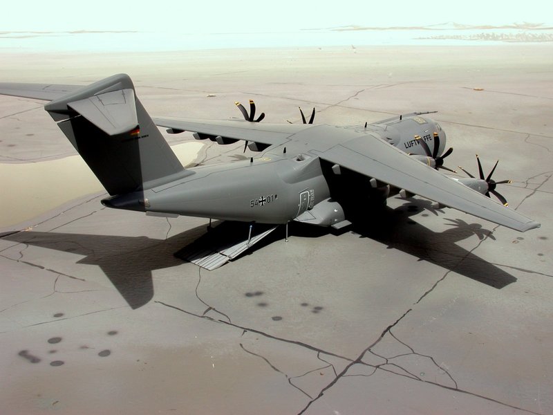 "Die A400M ist ein neu konstruiertes, militärisch genutztes Transport-/Frachtflugzeug das nicht nur die gestellten Anforderungen der Luftstreitkräfte im 21. Jahrhundert erfüllt, sondern auch für humanitäre und zivile Aufgaben eingesetzt werden kann. Sie ist größer, moderner und flexibler als bisherige Transporter. Mit einer maximalen Nutzlast von 37t können auch sperrige und übergroße Frachten nun schneller und direkter an den Zielort gebracht werden. Die vier Propellerturbinen der A400M haben eine Leistung von je 11.000 Wellen-PS und bilden damit die stärksten Propeller-Turbinen der Welt. Bisher haben Deutschland, Frankreich, Spanien, England, Türkei, Belgien, Luxemburg, Südafrika und Malaysia insgesamt 174 Maschinen des Typs A400M Grizzly bestellt."