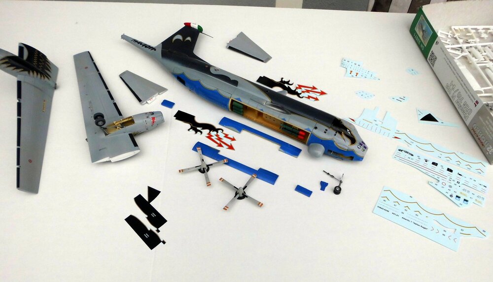 Nun aber zum "Großen Vogel", der auf Italienisch DER GROSSE KACKER heißt! Als ich vor vielen Jahren ein paar Bilder von der Maschine sah, wollte ich den sofort bauen! Leider gab es keine Abziehbilder! Und das Alles selber machen!? Nee, so genusssüchtig bin ich nun auch nicht! Jetzt hat Revell die Atlantic zurück auf den Basteltisch gebracht mit eben diesen Decals! Jetzt aber nur nicht glauben, das ist eine leichte Aufgabe! Nein, bestimmt nicht! Aber mit Lackier-Schablonen und den sehr guten Beschriftungen aus dem Hause Syhard-Decals klappt das. Aber noch ein gut gemeinter Hinweis: Bitte genau an die Bauanleitung halten!!! Sonst erlebt man Überraschungen! und die braucht Keiner! Und nebenbei: Das Ergebnis sieht umwerfend gut aus! Meine Meinung!!