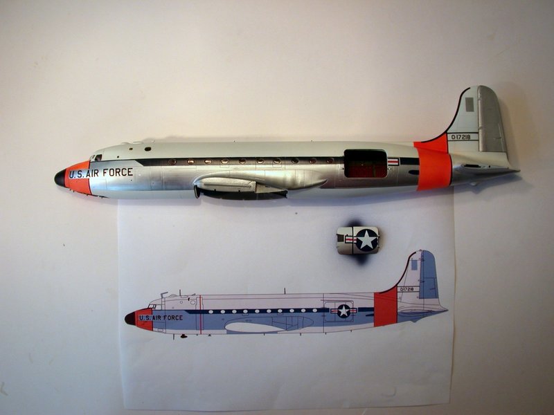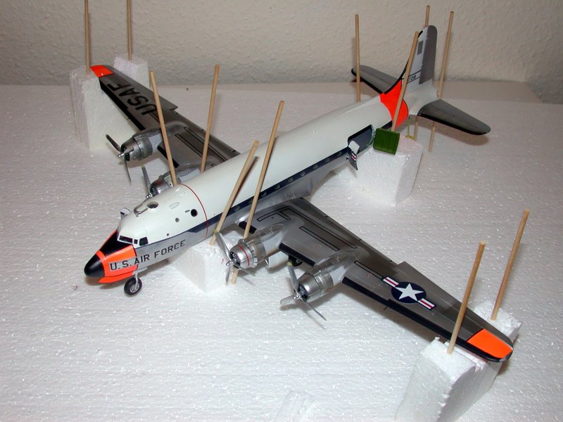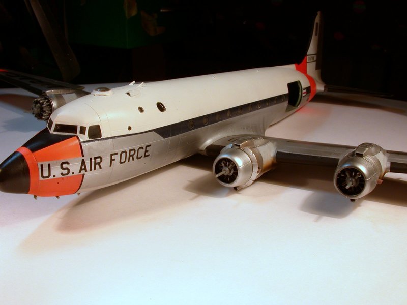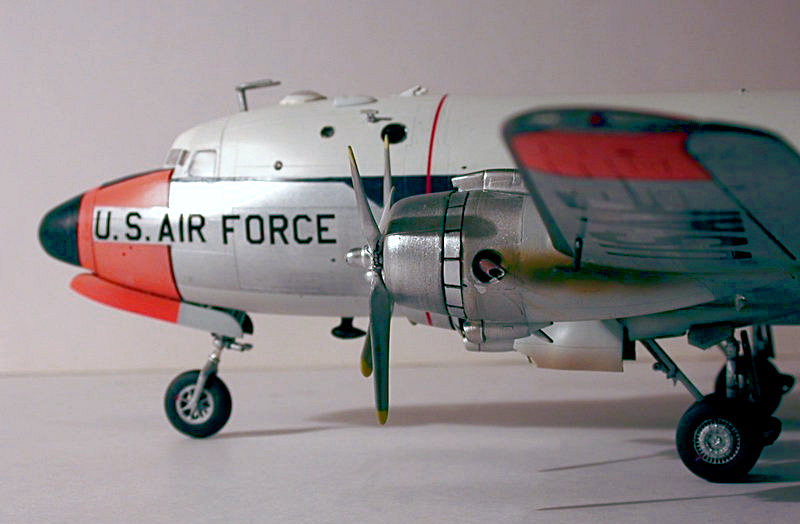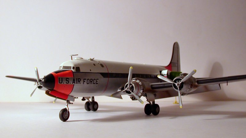 Vorbild: Die Douglas C-54 Skymaster war die von 1942 bis 1945 produzierte militärische Version der von der Douglas Aircraft Company gebauten kommerziellen Douglas DC-4. Sie hatte vier Propeller-Motoren und war für Personenflüge mit 30–40 Passagieren auf Langstrecken konzipiert. Besonders bekannt wurde sie durch ihren Einsatz bei der Berliner Luftbrücke (Rosinenbomber). (Wikipedia)