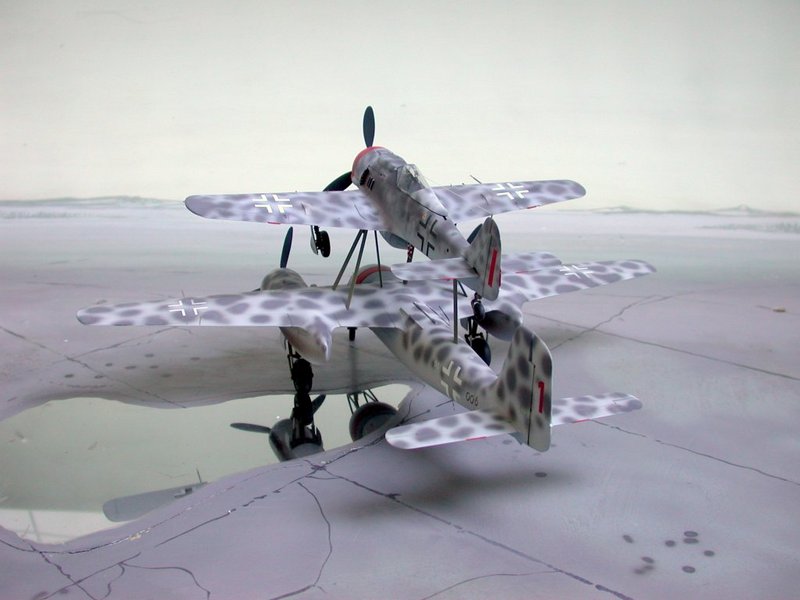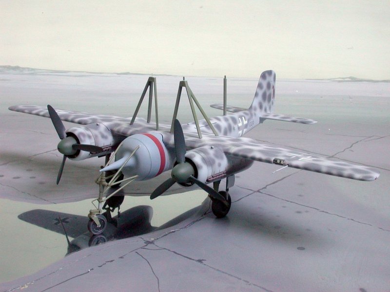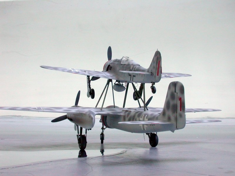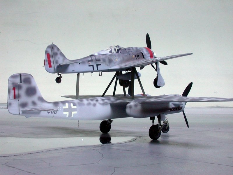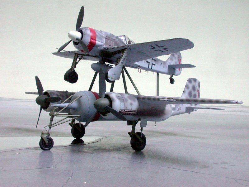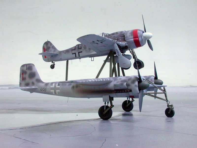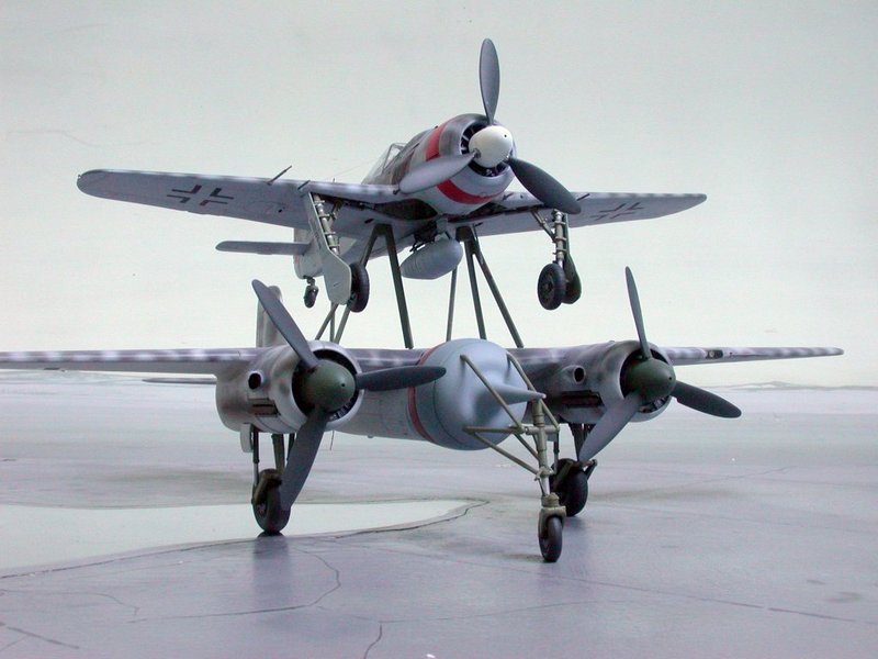 Hier ein paar Bilder der Mistel V, die nie flog. Die Bausätze stammen von Trimaster und Dragon und sind nun bei Revell im Programm. Wer das Modell so nicht bauen möchte, aber die beiden Focke-Wulf`s mag, sollte trotzdem zuschlagen!! Für mich persönlich ist das Modell der Fw 190A das Beste mit in diesem Maßstab.