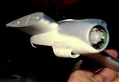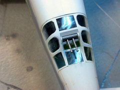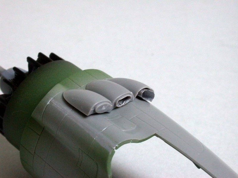 die drei Möglichkeiten: links das Original, in der Mitte nur der Auspuff ausgefräst, und rechts nur die Verkleidung stehen gelassen und aus einem Alublech-Streifen ein ovales Röhrchen gedreht und verklebt