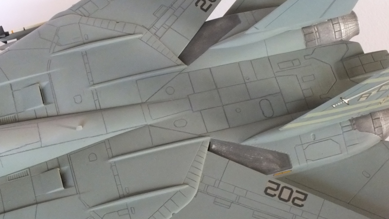 Nach der Lackierung und anschließend guter Durchtrocknung wurden die Panellines mit einem weichen spitzen Bleistift nachgezogen. Dies lässt die Panellines gleich in einem metallischen Look erscheinen. Der Nachteil hierbei ist, dass man sich leicht verzeichnen kann, und dass die Art der Panellinemarkierung sehr zeitaufwändig ist. Z u guter Letzt wurde das Modell mit Mattlack Nr.2 von Revell versiegelt, dies macht immer einen leicht seidigen Effekt.