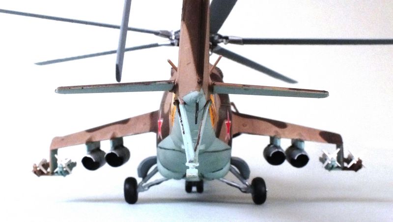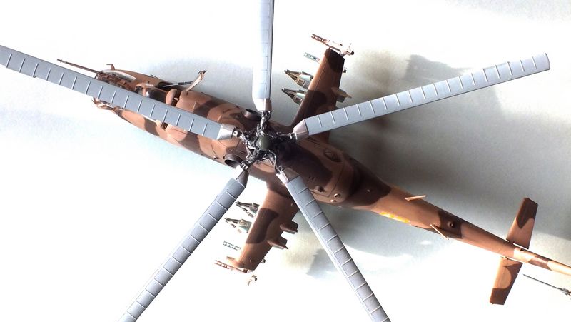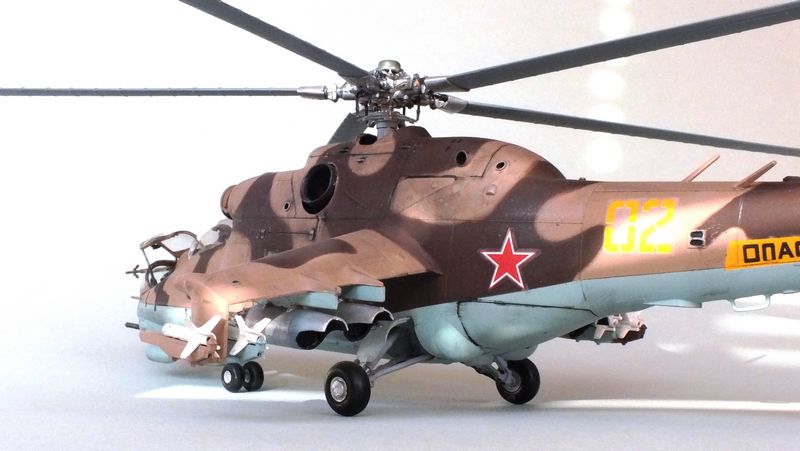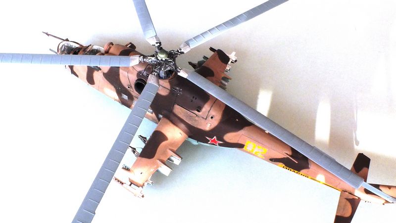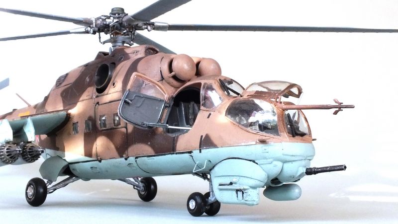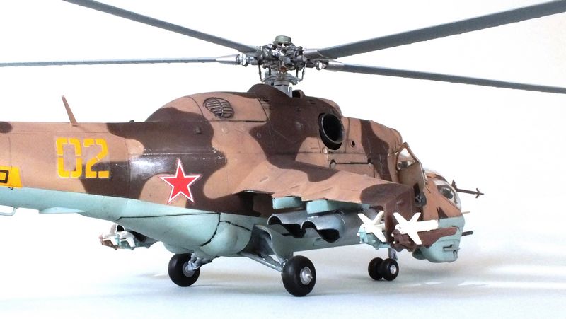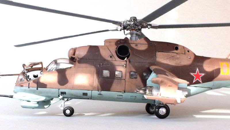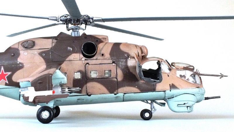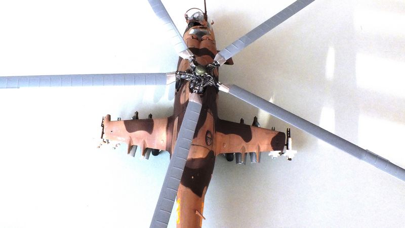 Vorbild: Der Mil Mi-24 NATO-Codename "Hind" zu gut Deutsch Hirschkuh ist ein Kampfhubschrauber, der in der Sowjetunion entwickelt wurde. Hersteller ist das Unternehmen Mil. Ungewöhnlich für einen Kampfhubschrauber ist die Fähigkeit des Mi-24, auch Truppen transportieren zu können. Der Mi-24 besitzt zwei Gasturbinen-Triebwerke und eine Haupt-Heckrotor-Anordnung mit fünfblättrigem Hauptrotor. Das Ausgangsmodell ist der Mil Mi-8, jedoch wurde der Rumpf vollkommen neu gestaltet. Im Gegensatz zu den meisten anderen Kampfhubschraubern kann der Mi-24 zudem Transportaufgaben übernehmen, beispielsweise acht ausgerüstete Soldaten transportieren.