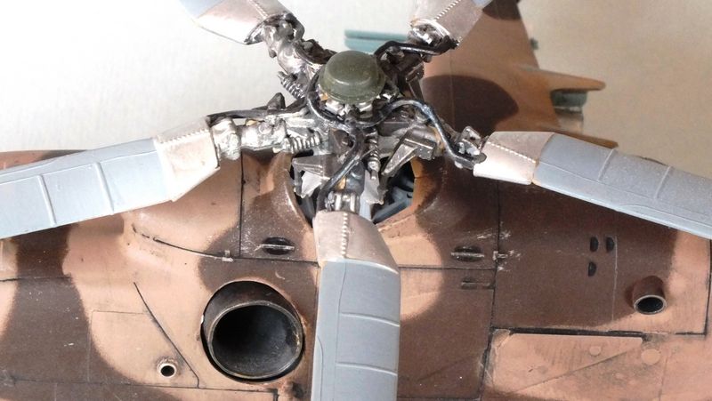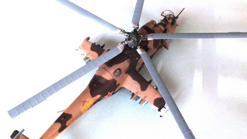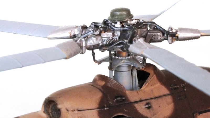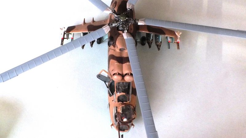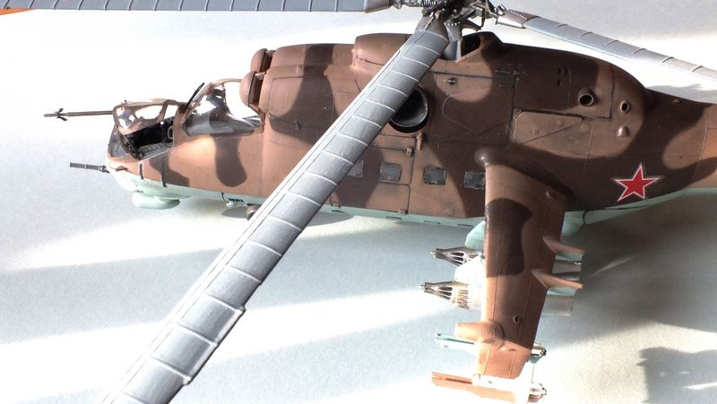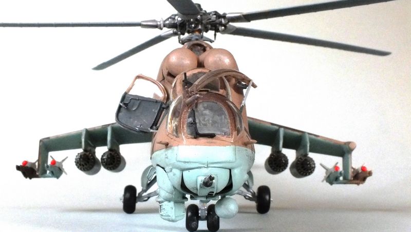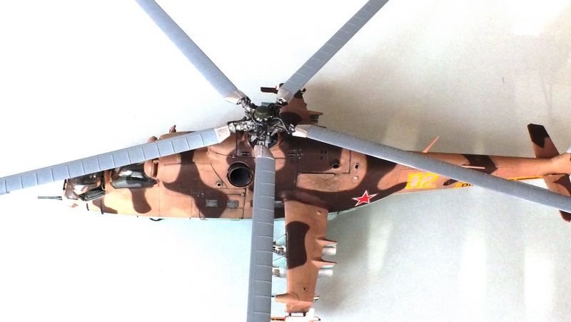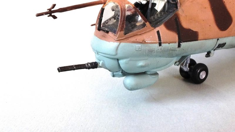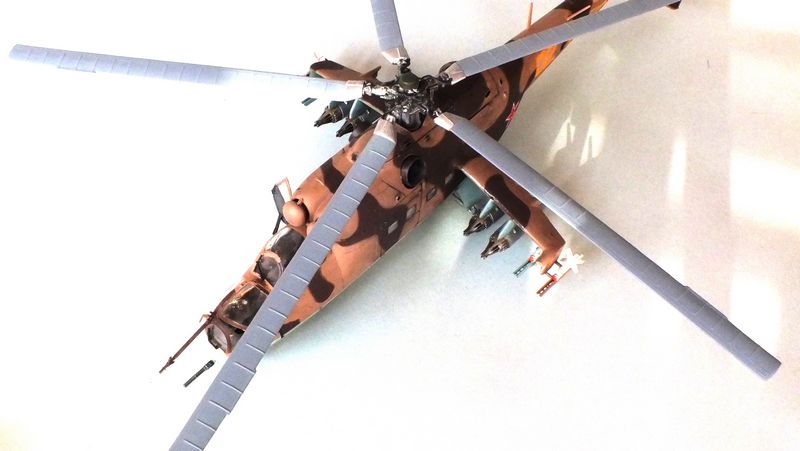 Vorbild: Der Mil Mi-24 NATO-Codename "Hind" zu gut Deutsch Hirschkuh ist ein Kampfhubschrauber, der in der Sowjetunion entwickelt wurde. Hersteller ist das Unternehmen Mil. Ungewöhnlich für einen Kampfhubschrauber ist die Fähigkeit des Mi-24, auch Truppen transportieren zu können. Der Mi-24 besitzt zwei Gasturbinen-Triebwerke und eine Haupt-Heckrotor-Anordnung mit fünfblättrigem Hauptrotor. Das Ausgangsmodell ist der Mil Mi-8, jedoch wurde der Rumpf vollkommen neu gestaltet. Im Gegensatz zu den meisten anderen Kampfhubschraubern kann der Mi-24 zudem Transportaufgaben übernehmen, beispielsweise acht ausgerüstete Soldaten transportieren.