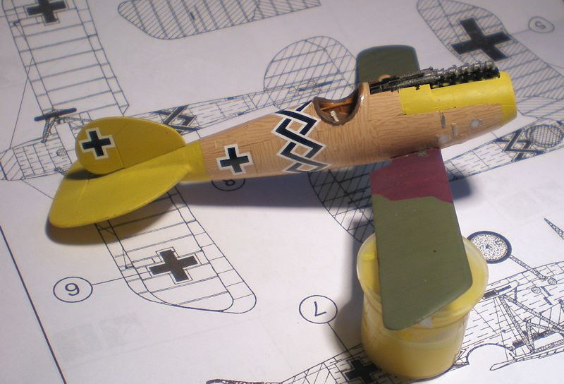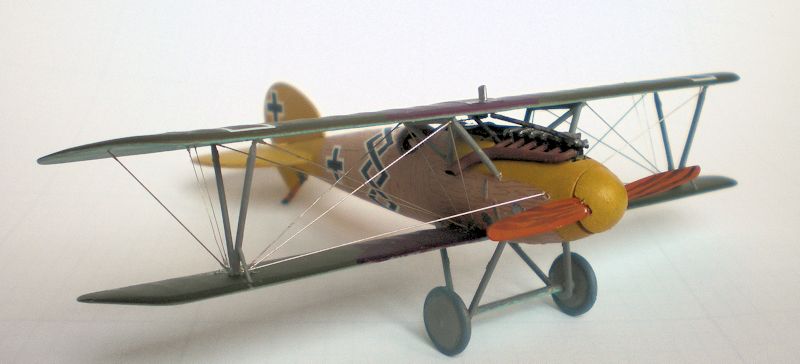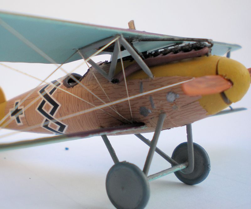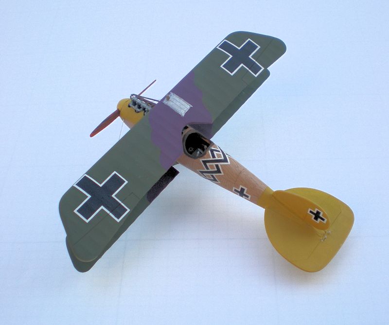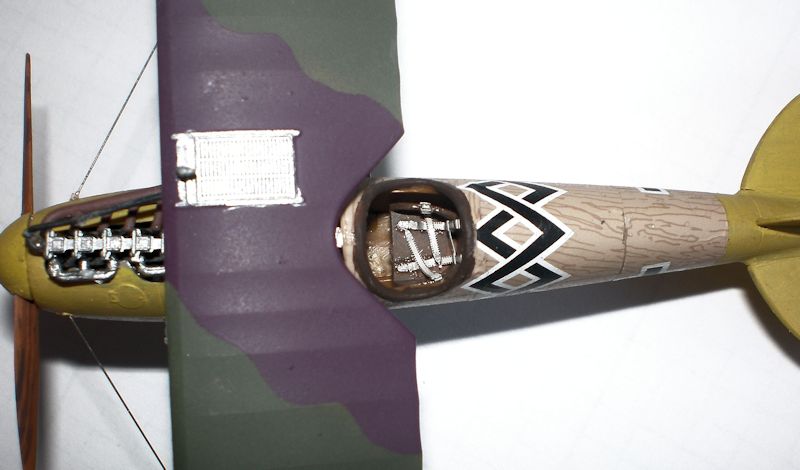 Leider hat Eduard die Leitungen vom Tragflächenkühler zum Motor vergessen, diese sollten unbedingt ergänzt werden, ebenso wie die Gurte. Verspannung und Steuerseile sind aus Silberdraht (0.1+0,2mm). Der Holzrumpf wurde mit Decals dargestellt, der Rest gespritzt.