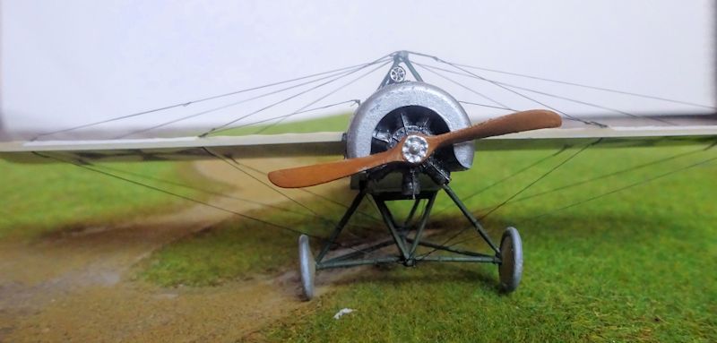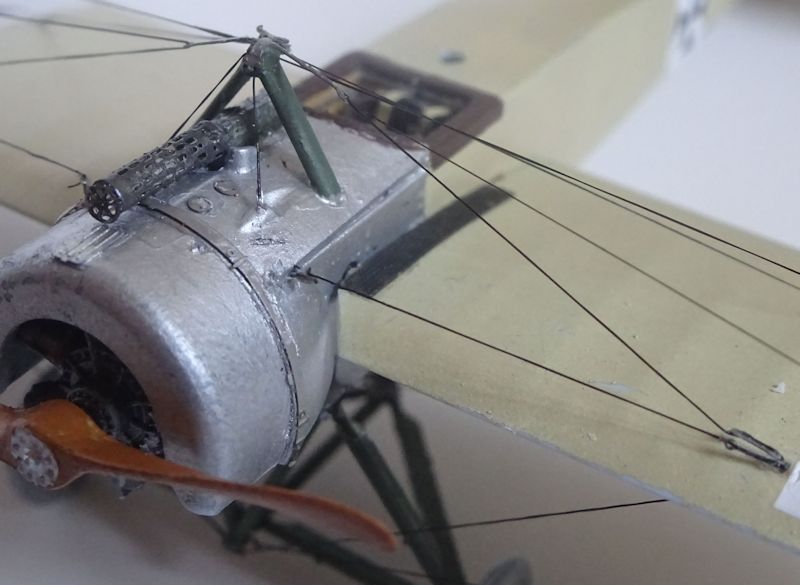Nach der Montage folgte die eigentliche Herausforderung - die Verspannung. Hierfür liefert Eduard kleine Spannschlösser und einen detaillierteren Spannturm. Das eigentlich spannende ist dabei die Möglichkeit, den Spanndraht durch ein kleines Loch im Spannschloss zu fädeln. Gute Augen (ersatzweise eine Lupe) und eine ruhige Hand sind unbedingte Voraussetzung. Der Spannplan von Airfix ist nur bedingt geeignet. Man sollte daher die entsprechenden Fotos aus der Literatur heranziehen. Entgegen meiner bisherigen Praxis das starre Polyesternähgarn (Monofil Madaira) zu verwenden, kam diesmal das dünne und flexible Garn von Infini Model zum Einsatz.