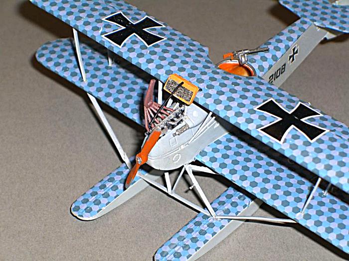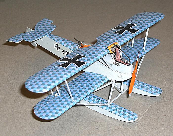 Bausatz: CMR hat wieder einen hochwertigen Bausatz vorgelegt. Die Hauptbaugruppen sind sauber gegossen, bei den Kleinteilen gibt es etwas mehr Reinigungsarbeit. Während sich der filigrane Kühler problemlos montieren lies, bereiteten die Tragflächen- und Schwimmerverstrebungen doch einiges Kopfzerbrechen. Die Bauanleitung war hier an einigen Stellen nicht sehr hilfreich. Besonders die beiden die Tragfläche direkt über dem Rumpf stützenden Spanntürme und die Rumpf-Tragflächenstreben mußten in Länge und Lage angemessen werden, da bei letzteren die angegebenen Montagepunkte nicht paßten. Gleiches trifft auch auf die Schwimmerkonstruktion zu. Nach Anbringung der wiederum sehr guten Abziehbilder und Abschluß der Montage entschädigte der Blick auf ein gelungenes Modell für die aufgewandte Mühe.