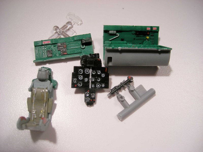Bausatz: Wie gehabt startet der Bau mit dem Cockpit, das auf den ersten Blick einen guten Eindruck macht. Bereits der Grundanstrich setzt die Wahl des Einsatzlandes voraus, kamen doch die MiG-21 F-13 neben dem vorgeschlagenen Blauton auch im typischen Grün (CSSR) und in Schwarz (teilweise DDR) daher. Ich habe hier mal auf das kräftige Grün von Zvezda (Nr59) zurückgegriffen. Das Instrumentenbrett war grün oder schwarz. Die Trumpetervorlage stimmt mit keinem Foto überein die Seitenkonsolen teilweise. Hier habe ich mit Eduardresten optische Verbesserungen vorgenommen. Abschließend folgt der Schleudersitz.