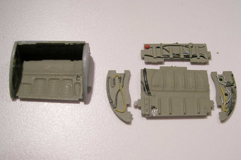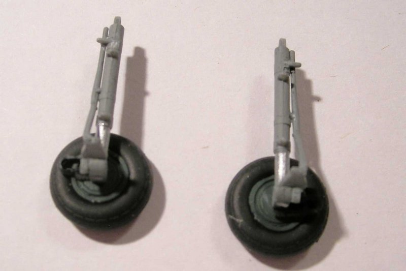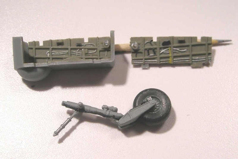 Weiter geht es mit dem Bugfahrwerk und bereits hier lässt uns Trumpeter mit rudimentären Farbhinweisen allein. Die meisten Fotos geben für den Fahrwerkschacht graugrün („RLM02“) oder alu an. Das Fahrwerk ist grau und die Felge grün. Der Zusammenbau ist problemlos, Kabel und Bremse verbessern die Optik. Gleiches gilt für den Hauptfahrwerkbereich.