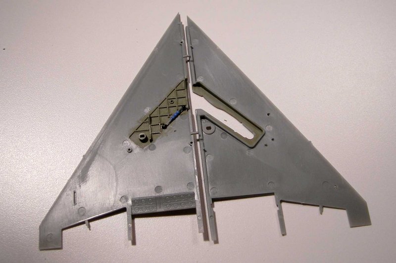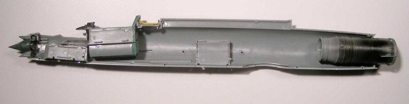 Das Triebwerk ist ausreichend detailliert. Allerdings sollte der schmalbrüstige Ring zur Steuerung des Düsendurchmessers (W9) durch einen breiteren ersetzt werden. (Eduard?) Jetzt werden die bisherigen Baustufen in die Rumpfhälften eingebaut. Ich habe auf die geöffnete Elektronikbucht verzichtet, da Teil V45 mit keinem Foto übereinstimmt. Obwohl im Bauplan nicht vermerkt habe ich hier und hinter dem Bugkegel (V7) etwas Gewicht eingebaut