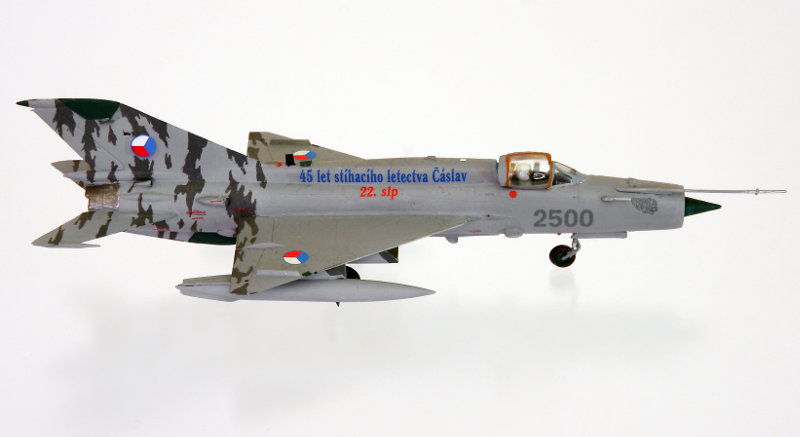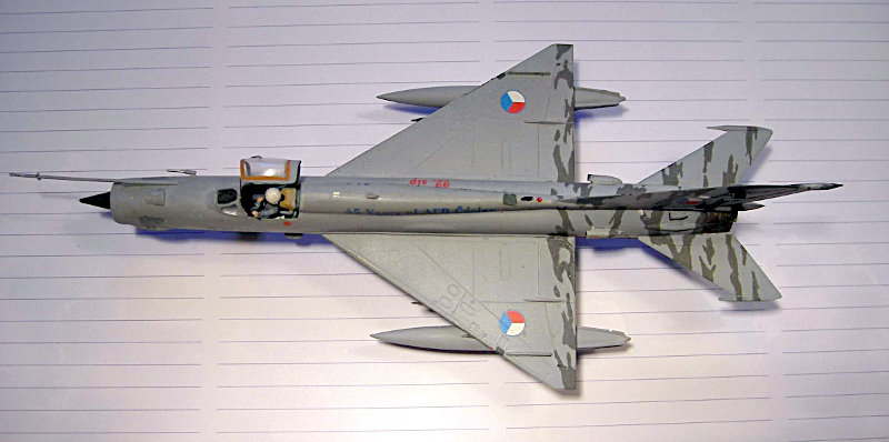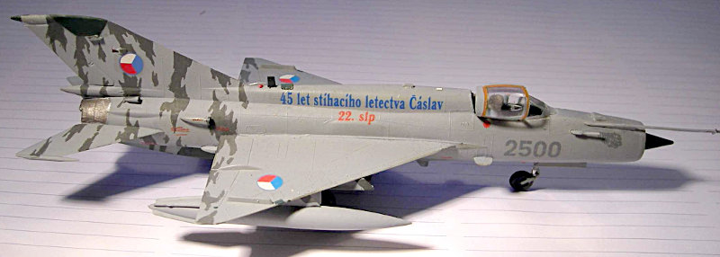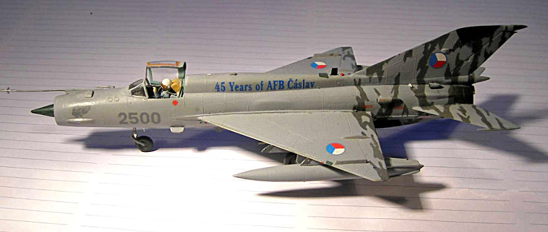Schon vor längerer Zeit habe ich den Koprobausatz der MiG-21MF in eine NATO kompatible MFN umgebaut. Hierbei sind die meisten Veränderungen Antennenanbauten. Als Bemalungsvariante wurde der Begemotbogen mit der Sonderbemalung für die MiG-21MFN Nr.2500, CR, 41. slp, Caslav October 2002 verwendet.