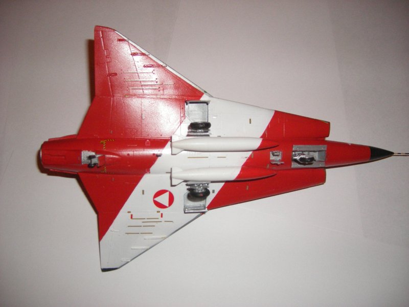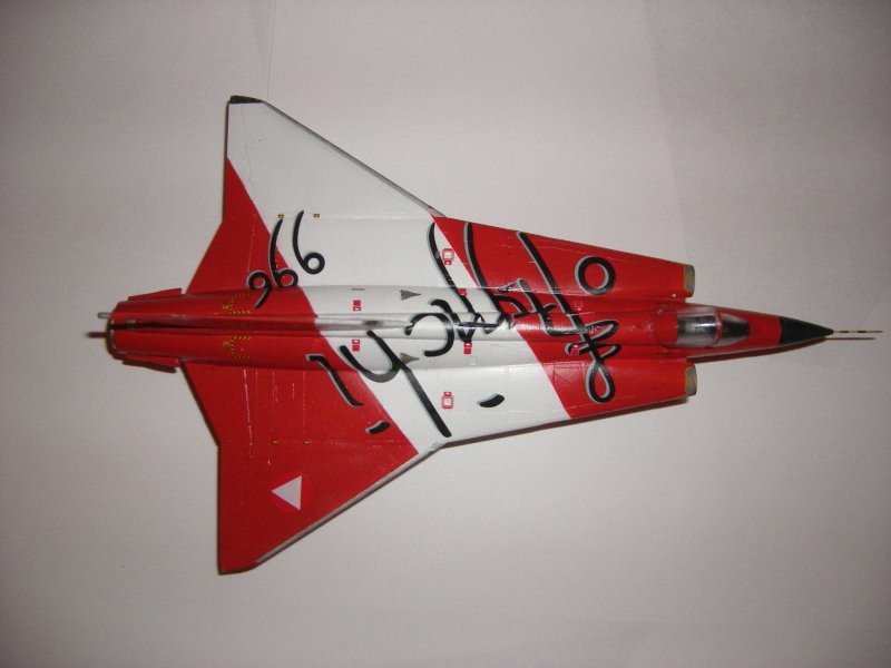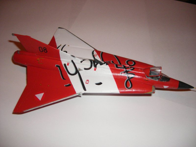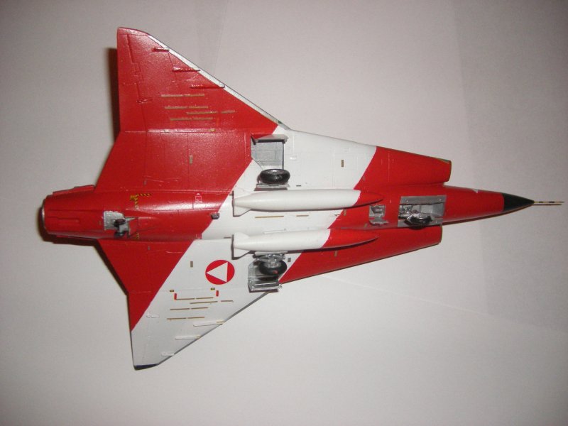 Nach einer längeren Bastelpause ist der Umbau des Hasegawa "Draken" mit Hilfe der Zurüstteile von IPMS Austria endlich fertig. Neben dem anderen "Draken" stehend, fallen die baulichen Besonderheiten wie z.B. Heckkonus mit Dispensern, Radarempfänger für das Seitenleitwerk des Jubiläumsmusters deutlich ins Auge. Diese Teile ließen sich gut verarbeiten und passten ohne größere Nacharbeiten. Einzige Ausnahme beim Übergang Rumpf-Heck benötigt man doch etwas mehr Spachtel.