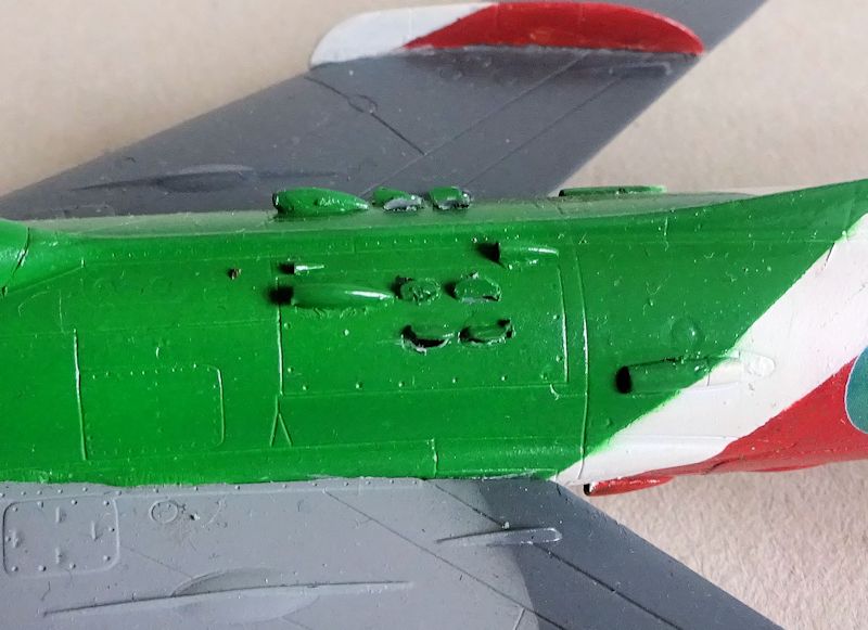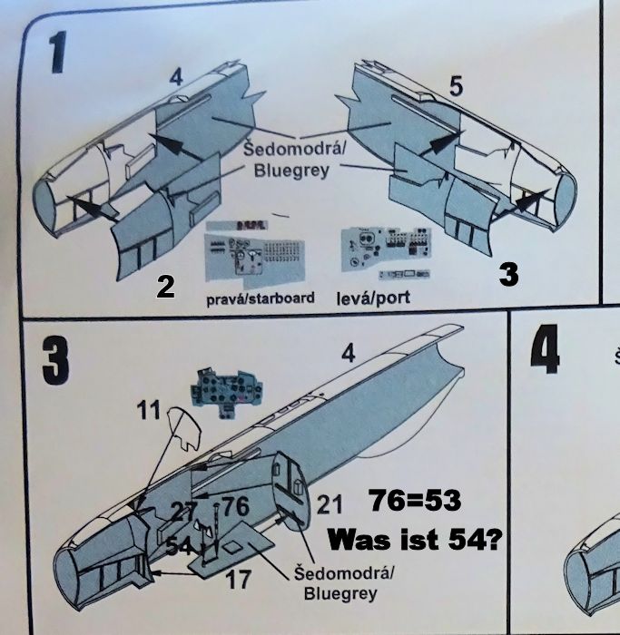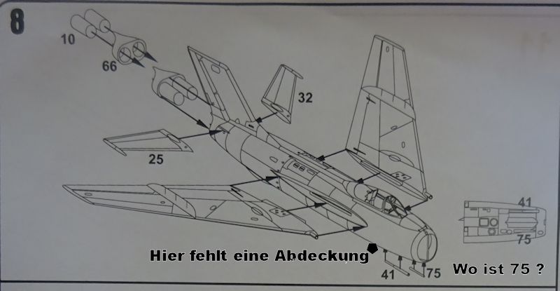 Die Krux des Bausatzes liegt in den zahlreichen Alternativteilen. Hier hilft die Bauanleitung nur bedingt, da sie zwar mit einem "?" darauf hinweist, aber keine genaue Typ- oder Dekozuordnung vornimmt. So muss man selbst rausfinden ob Teil 55 oder 39 richtig ist. Die genaue Position der RW-2 Antennen (Teil 28) ist auch nicht zu erkennen. Die Möglichkeit, dazu die Unterseitenzeichnung zu verwenden, wurde verschenkt. Im Schritt 9 ist noch zu beachten das Teil 59 eigentlich 58 ist und 61 ist 59.