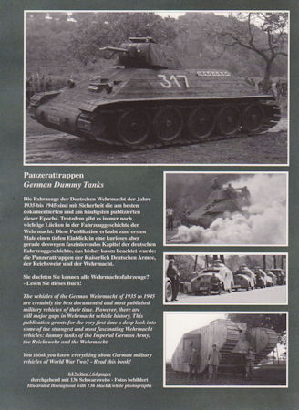 Kann man mit Panzerattrappen ein 64 seitiges Heft füllen? Ja, Jochen Vollert hat es vollbracht! Mittels 136 Schwarz/Weiß-Fotos zeigt er uns die Panzerattrappen in deutschen Militärdienst von der Kaiserzeit über die Reichswehr bis zur Wehrmacht. Neben den hervorragenden Fotos gibt es dazu auch fundierte Texte und eine Einleitung sowie Begriffsdefinition vorweg.