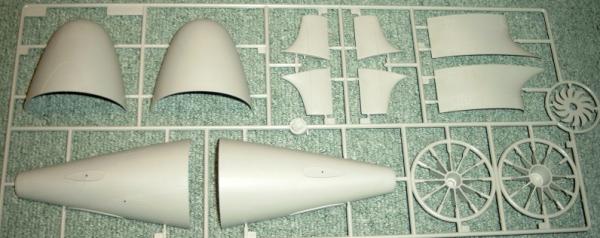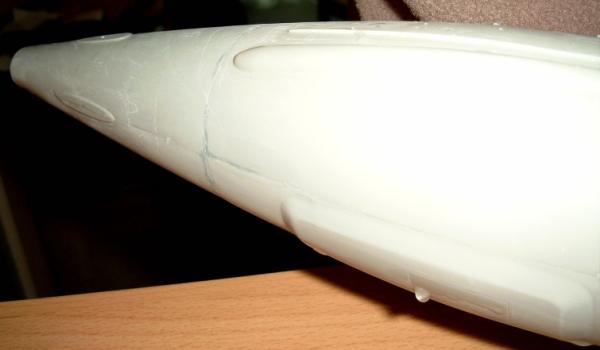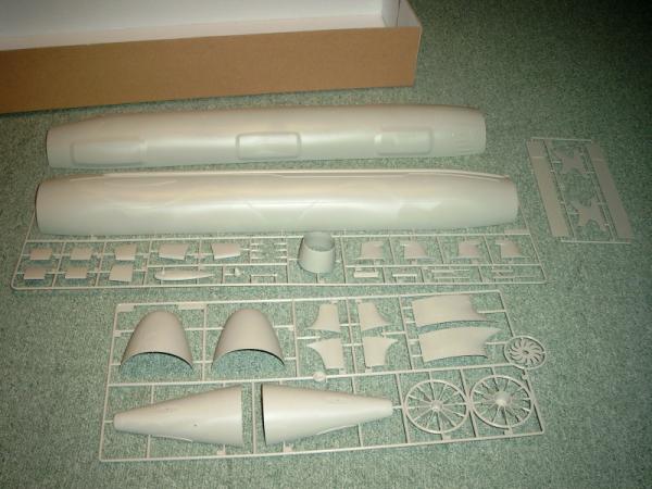 Zum Modell: Aus 45 Teilen, verteilt auf 3 Spritzlinge soll ein 77 cm langes und 12 cm breites Modell entstehen. Also schon vorher den Vitrinenplatz ausprobieren! Aufgrund der wenigen Teile geht der Bau sehr schnell von Stapel. Jedoch gibt es auf Grund der Größe der Teile leichte Passprobleme. Vermutlich sind 6 Stifte und 4 Führungen für die beiden Rumpfhälften zu wenig. Hier sollte man vielleicht noch Sheet hinterkleben. Ich jedenfalls benutze Revell-Tubenkleber für die Grobpassung und anschließend Flüssigkleber für kleine Spalten, welche sich unter Druck verschlossen.