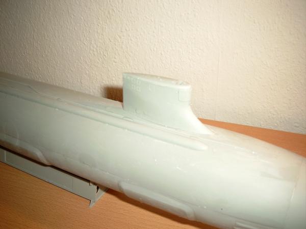 Bei den Bug- und Heckteilen trug ich auf die Nut Tamiyaspachtel auf, welcher sehr dünn wird, wenn er sich mit dem Flüssigkleber vermischt. Dadurch verschließen sich hier sehr gut die Spalten. Dennoch kommt um eine Verschleiforgie(schon allein durch die Größe) nicht herum. Aber bei so großen Plastikteilen war das irgendwie schon fast zu erwarten. Jetzt kann man die Ruder und den Turm zusammenkleben. Hier gibt es keine Probleme. Die Sehrohre sollte man erst ganz zum Schluss montieren, um Bruch zu vermeiden.