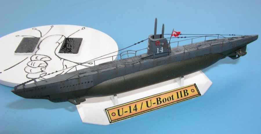 Hintergrundinformationen:: Dem sehr schön gemachten Beipackzettel kann man entnehmen, dass ca. 20 U-Boote der Baureihe II B hergestellt wurden. Das im Bausatz dargestellte U-14 hatte seinen Stapellauf am 6. Juli 1935 in der Werft Deutsche Werke in Kiel. Vier der insgesamt 11 Kommandeure erhielten das Ritterkreuz und mit einer Quote von 12344 BRT bei 9 versenkten Schiffen hat sich das relativ kleine U-Boot relativ wacker geschlagen. Das Ende ereilte die U-14 am 2.Mai 1945 in Wilhelmshafen durch Selbstversenkung.