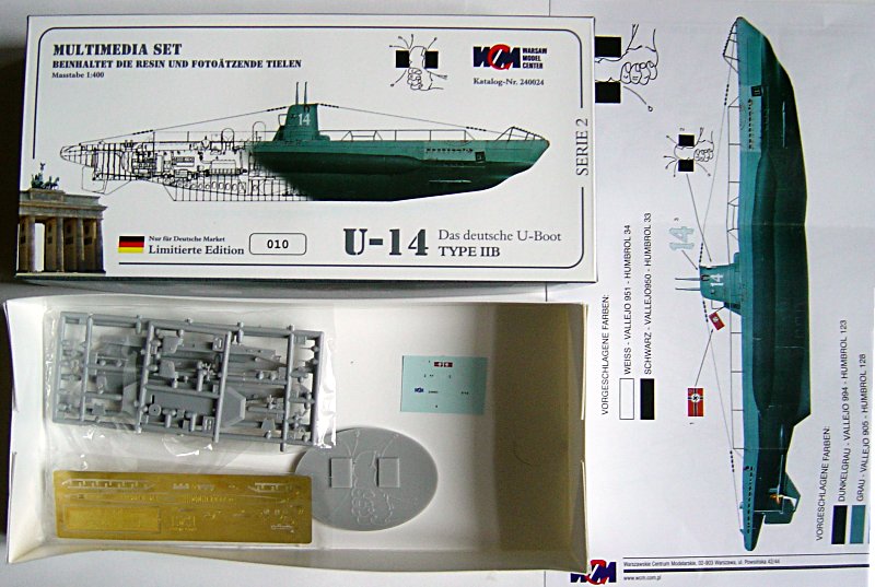 Zum Bausatz: Die Plastik Bauteile des Bausatzes sind dem Einen oder Anderen eventuell bereits schon von Mirage bekannt. Von der polnischen Firma Warzawskie Centrum Modelarskie oder kurz gesagt WCM, zeigt die Neuauflage jedoch drei deutliche Verbesserungen: Erstens enthält der Bausatz eine sehr gut gemachte, übersichtliche und zudem farbige Bauanleitung. Zweitens liegt das Wappen der U-14 - ein gequetschter Daumen - als Resin Plakette bei. Beim Anblick dieses Teiles ging mir persönlich jedoch der Gedanke durch den Kopf, dass ein Resin Turm oder Kleinteile aus Resin wie Sehrohr oder Schnorchel wesentlich sinnvoller gewesen wären. Als Drittes kommt nun aber der echte Höhepunkt, denn dem Bausatz liegt ein passender Ätzteilesatz bei. Dieser ist zwar auch fast identisch mit dem von Mirage, jedoch kann ich mich erinnern, dass ich ziemlich lange suchen musste, bis ich irgendwann einmal einen davon in Händen hatte.