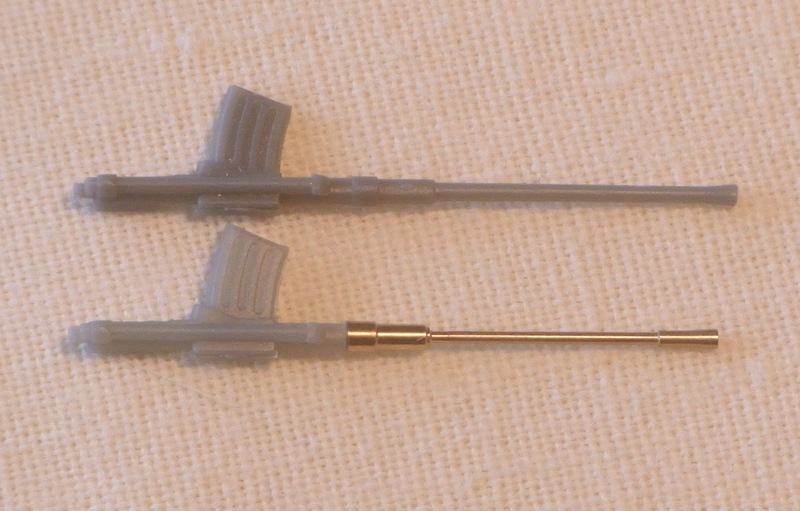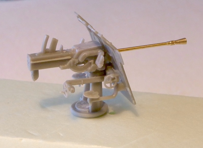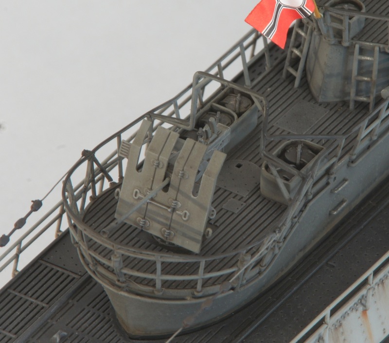 Wie beim gesamten Bausatz sind auch an den FlaK-Waffen deutliche Verbesserungen bei der Darstellung gegenüber der VII C festzustellen. Auch hier sind alle Details deutlicher ausgearbeitet. Wer mag, kann aber auch hier wieder auf die gedrehten Rohre von Robert Schatton zurückreifen, der nicht nur die Rohrwaffen anbietet, sondern auch wieder gedrehte Periskope speziell für diesen Bausatz angefertigt hat. Leider hat sich bei der 3,7 cm FlaK ein Fehler eingeschlichen. Die Halterungen der beiden Sitze sind an den beiklappbaren Seitenteilen des Schutzschildes befestigt und nicht an der Lafette. Mit etwas Eigenleistung und etwas Plastikrundstabmaterial kriegt man das aber hin.