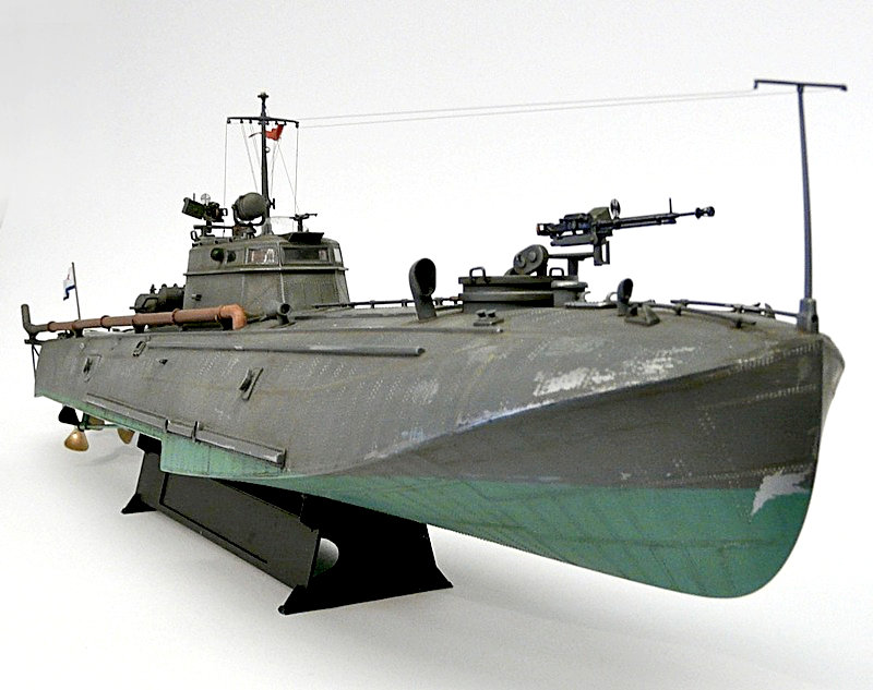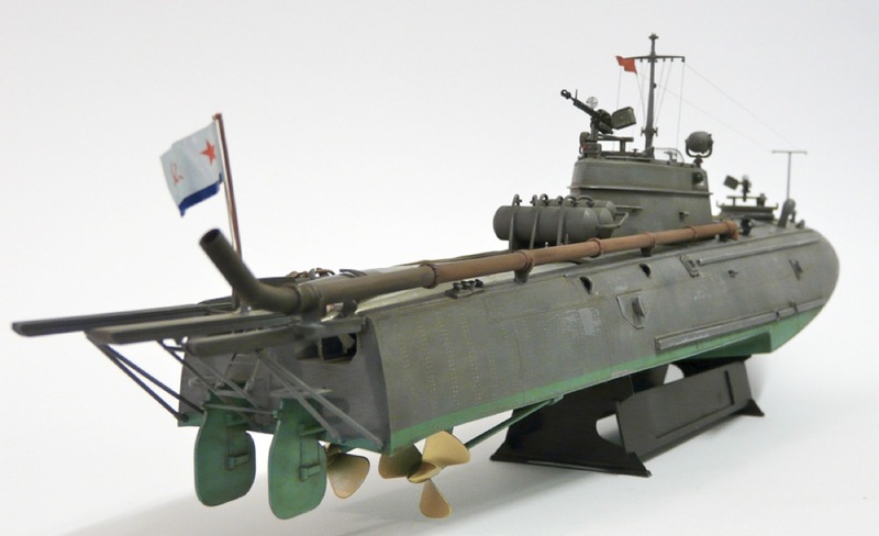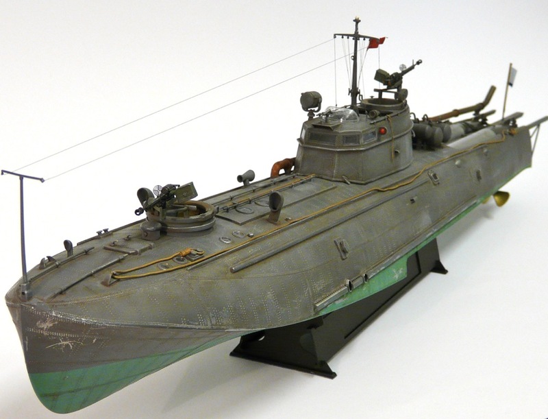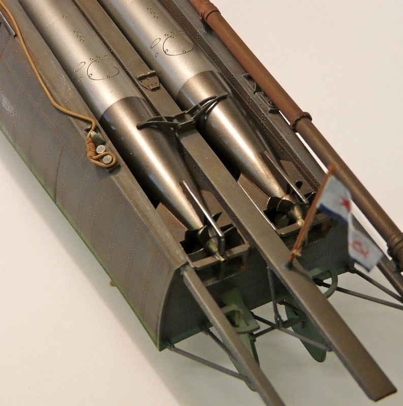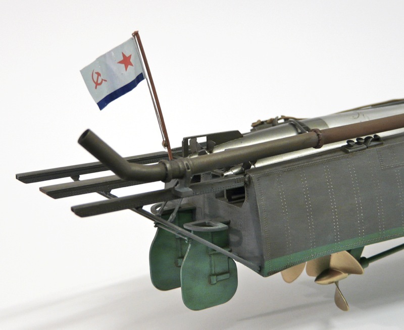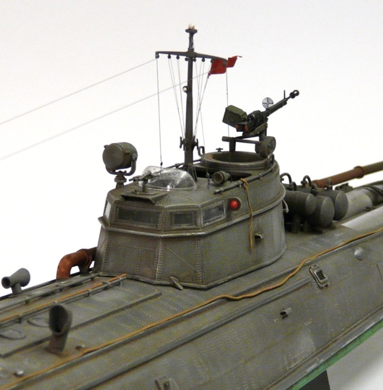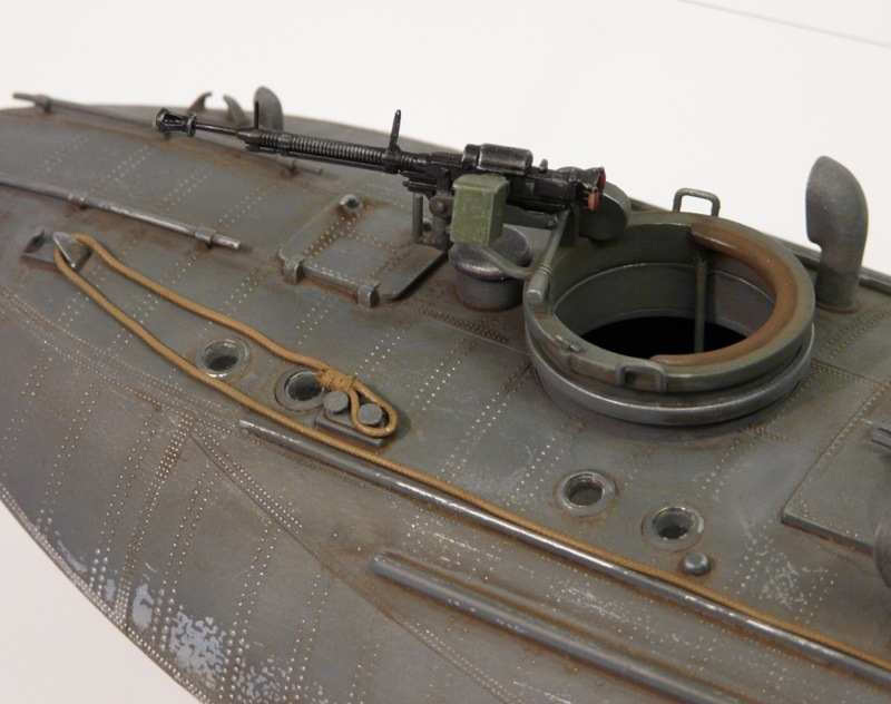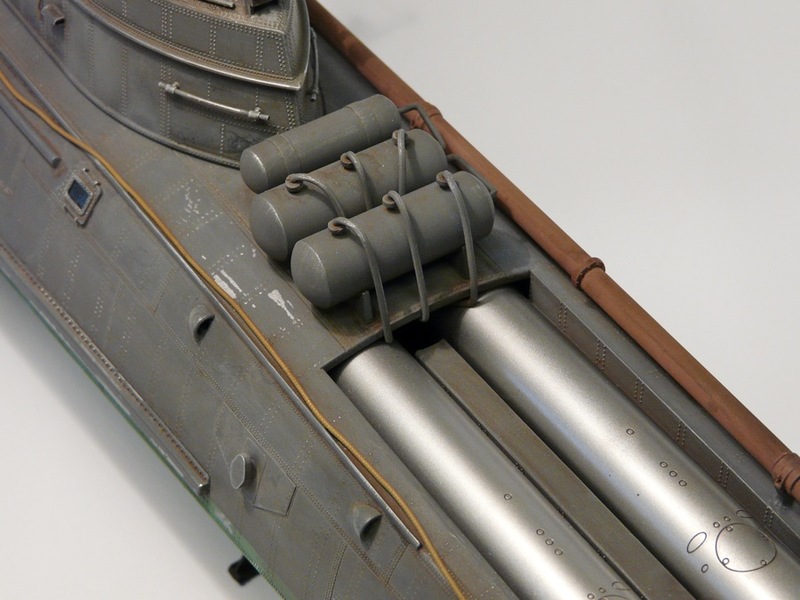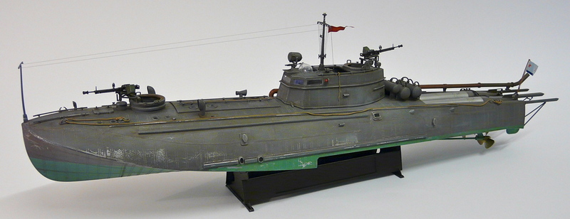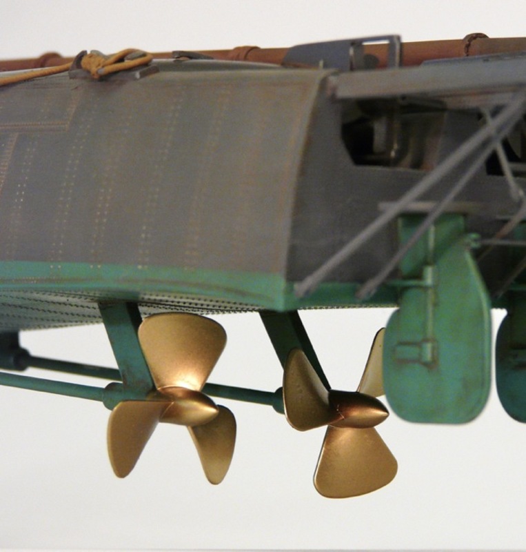 Die Bemalung erfolgte mit ALCLAD II "Aluminium" auf einem hochglanz-schwarzen Grundanstrich mit Tamiya-Acryllack. Alle anderen Farben stammen aus dem Revell-Aquacolour Sortiment. Für den Oberseitenanstrich verwendetet ich "Geschützgrau" und für den Unterwasseranstrich "Patinagrün". Vorher allerdings, wurde der Aluminiumanstrich mit Haarlack übersprüht um später den verwitterten Anstrich erzeugen zu können. Ein Ölfarben-washing mit "Umbra-gebrannt" sowie noch etwas Trockenbemalung vervollständigten die Bemalung des Modells.