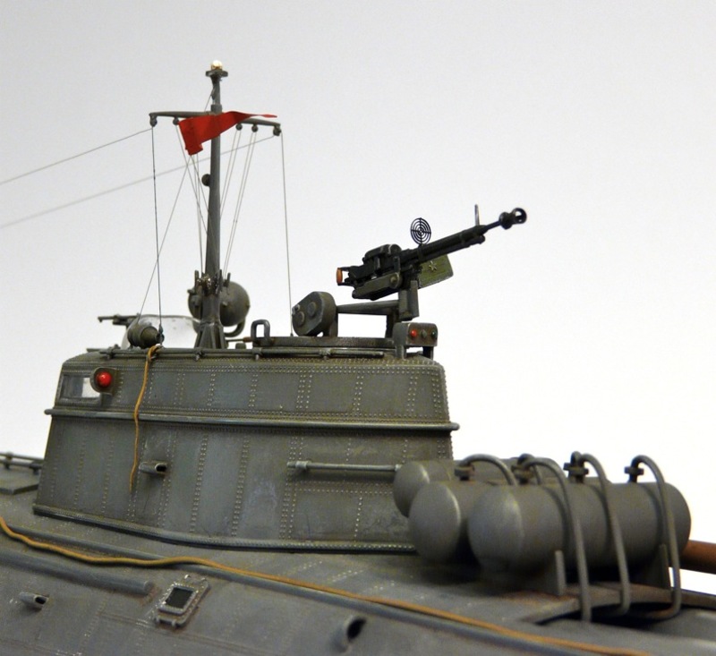 Von Markierungen habe ich Abstand genommen, da ich kein bestimmtes Fahrzeug darstellen wollte. Die Seekriegsflagge und der rote Wimpel wurden mit Bleifolie und dem unbewegten Flaggendecal des Bausatzdecalbogens erstellt.