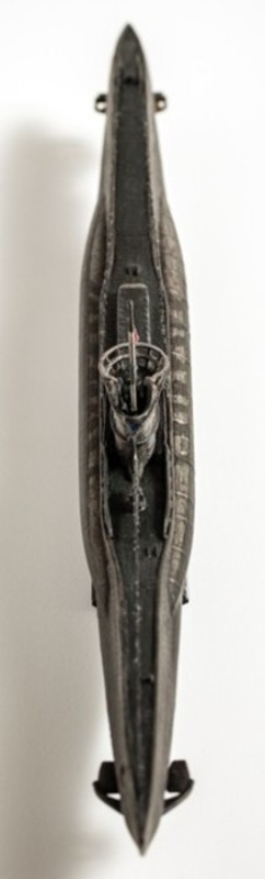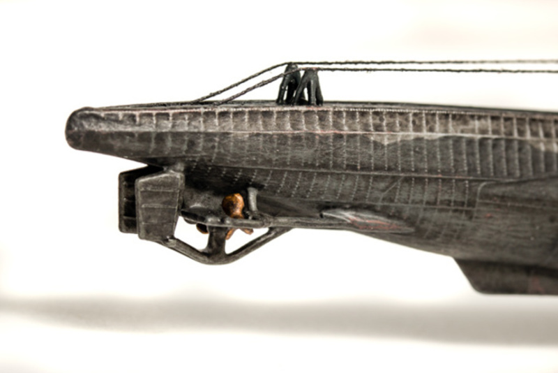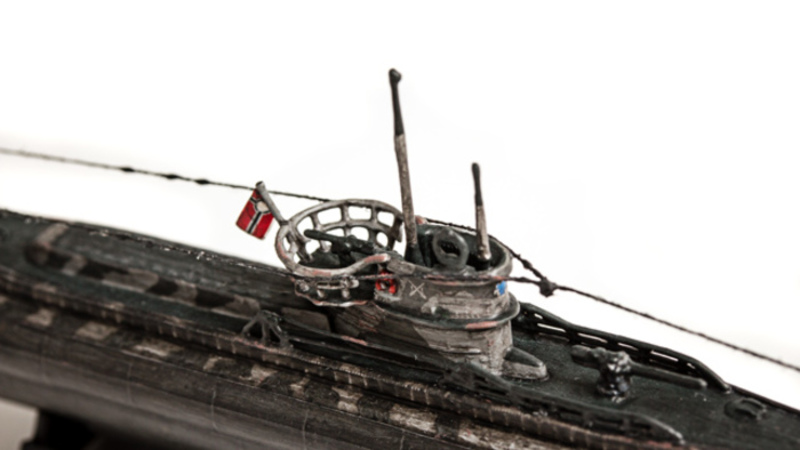 Es ist rein aus der Schachtel gebaut. Im Eigenbau hingegen entstanden die Netzabweiserantennen aus geeignetem Nähgarn und die Relings an der Seite auf Höhe des Turms aus 0,2mm Kupferdraht. Hier habe ich mich so gut es geht an Originalbilder orientiert.