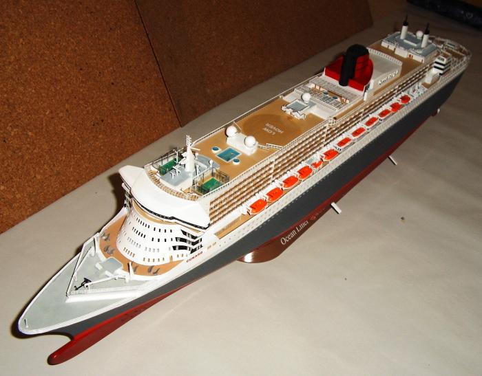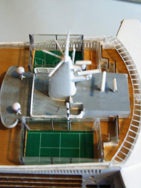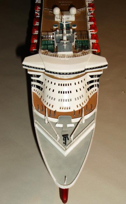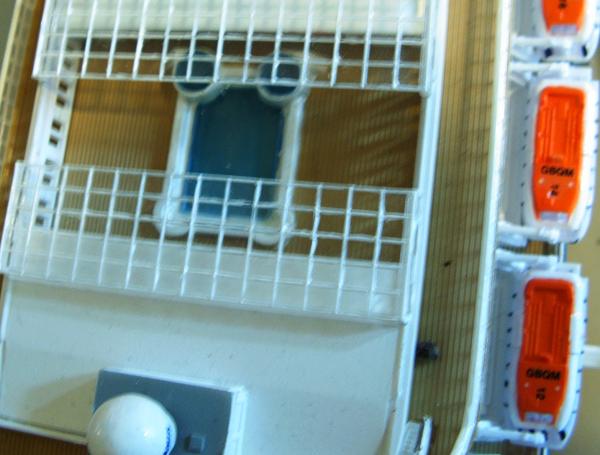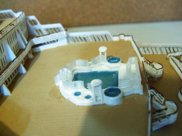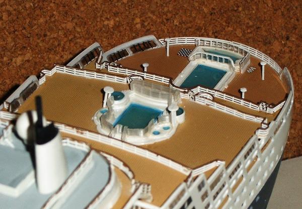 Hier ein kleiner Tipp zum Verbessern des Modells: In einer Modellzeitung habe ich eine gute Idee zur Darstellung von Wasser ohne große Kosten und Experimente gefunden. Diese kann man sehr gut auf die Schwimmbecken an Bord anwenden. Im Hobbyshop besorgt man sich dazu die Fenstermalfarbe Glasklar. Die Becken werden blau eingefärbt und nach dem Trocknen der Farbe können die Schwimmbecken mit der Fensterfarbe gefüllt werden. Die Fensterfarbe greift die aufgetragenen Farben nicht an. Allerdings man muss etwas Geduld haben, da das Durchtrocknen recht lange dauert und man mehreren Schichten auftragen muss (Schrumpfung!). Das Ergebnis ist aber erstaunlich!
