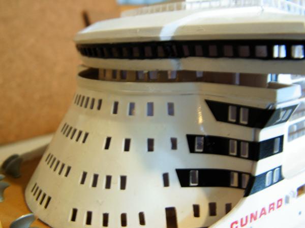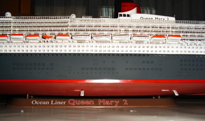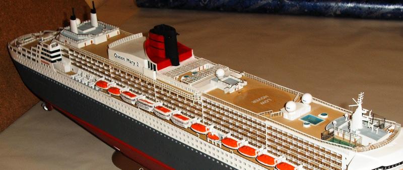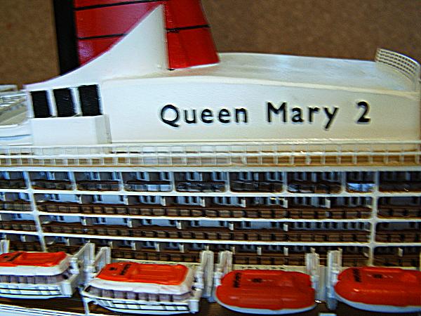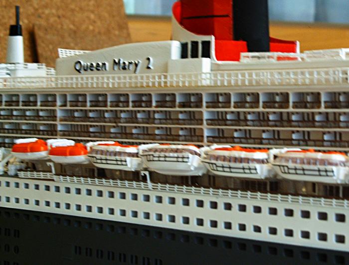 Was mich etwas ärgerte, waren die "super dicken" Fenster im Heckbereich. Hier wäre es schön gewesen, wenn Revell Vertiefungen wie an den Flugzeugmodellen in 1/144 angebracht hätte. Das überstehen sieht nicht gerade schön aus und ist auch nicht originalgetreu. Wer im Fernsehen das Einlaufen der Queen Mary beobachtet hat, wird dies bestätigen können. Im Buchhandel ist für 10 Euro ein Buch über die Queen Mary 2 erhältlich. Es erleichtert in vielen Punkten den Bau. Insbesondere durch sehr viele Innen- und Außenaufnahmen. So habe ich nach dem Bemalen der Balkone feststellen müssen, dass nur jede zweite Strebe zu bemalen gewesen wäre, was mir eine Menge Zeit gespart hätte. Also nächstes Mal vor dem Zusammenbau recherchieren.