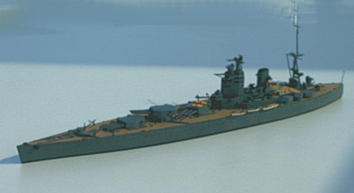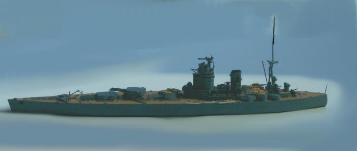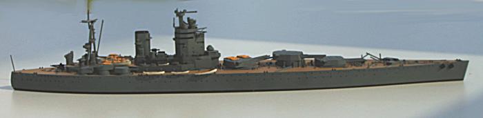 Interessantes englisches Schlachtschiff (BB) der Nelsonklasse aus der Zeit des 2. Weltkriegs, weil hier einmal eine andere Anordnung der Geschütztürme versucht wurde. In der Praxis ergaben sich aber nicht die erhofften Vorteile und mit Pearl Harbour endete ohnehin die Ära derartiger Großkampfschiffe.