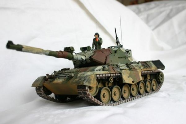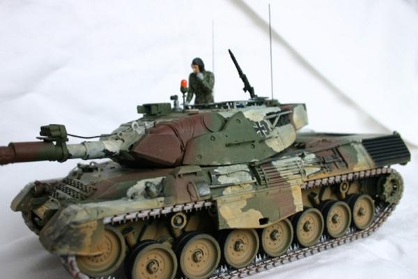 Ich verwandte die Tamiya-Acrylfarben in den NATO-Tönen. Das Fahrzeug stellt einen Leo 1 A5 vom PzBtl 413 während einer Übung im CMTC Hohenfels da. Da selbige im Winter ablief, hat die Raubkatze einen temporären Winteranstrich erhalten. Hierzu verwand ich dünne weiße Farbe und brachte sie mit einen relativ harten Pinsel auf. Als Vorbildfoto diente mir das Bild aus dem Fahrzeug Profile Band 22.