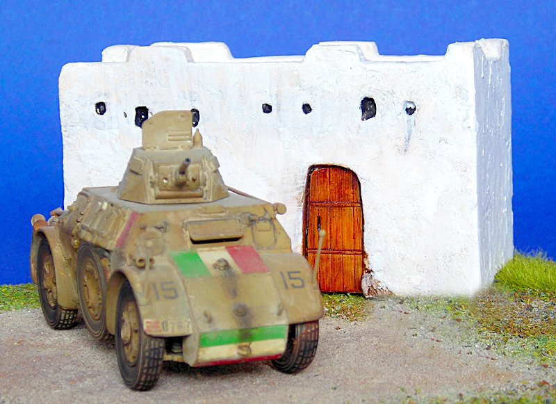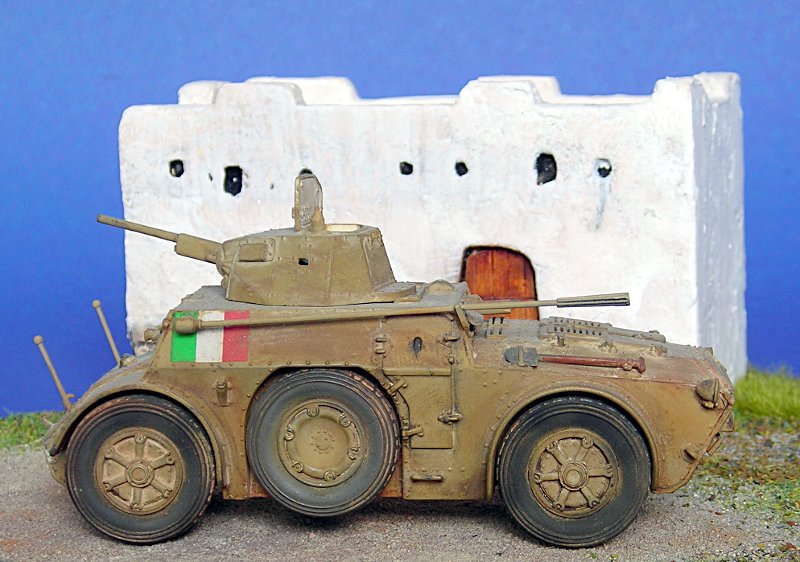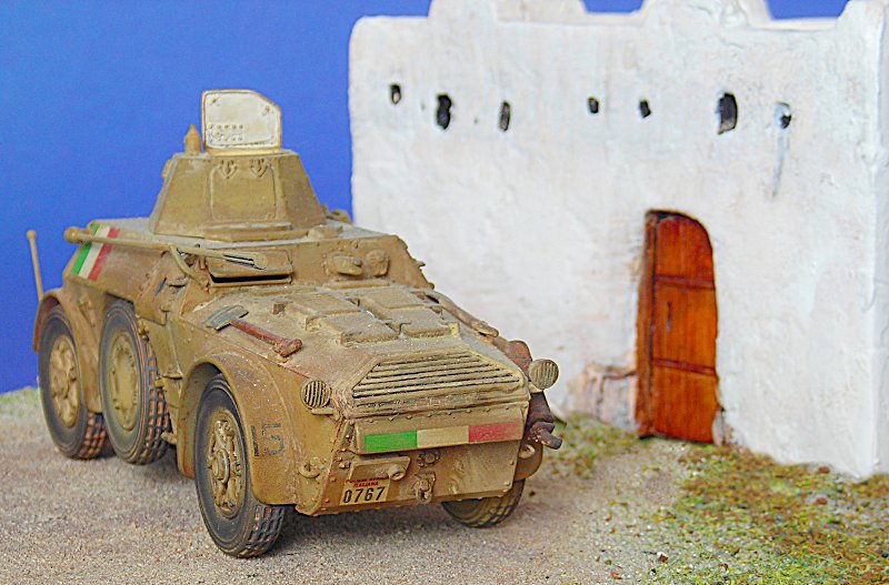 Hier habe ich keine Experimente gewagt. Als Basis ein sandgelber Farbton über alles, Klear, Abziehbilder, Washing, Mattlack, Pigmente. eine abschließende Behandlung gibt es, wenn das Diorama steht ... bis jetzt existiert diesees jedoch nur in meinem Kopf. Die Abziehbilder waren etwas störrisch und mussten nachgearbeitet werden. Eine beschädigte Nummer habe ich aus einem Tamiya reissue entnommen. Das Modell stellt ein Fahrzeug der italienischen Polizei in Nordafrika dar.