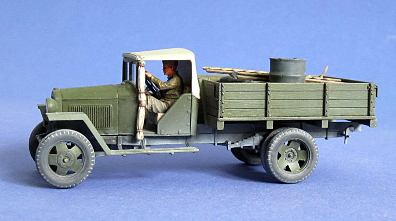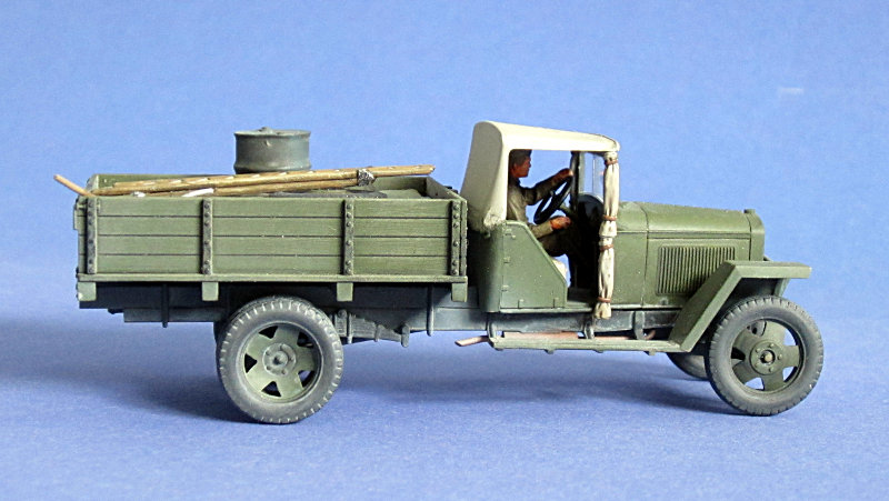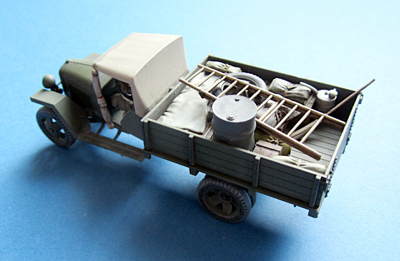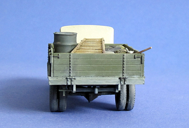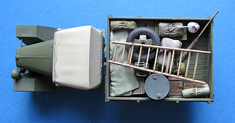 Für den Lastkraftwagen habe ich mir noch die Beladung von Red Zebra Ltd besorgt (First Look). Hinzu kamen noch einige Teile aus dem Oil and Fuel Set von Brengun (First Look) sowie eine Leiter aus einem Bausatz von ICM. Letztere ist eine Idee die Jean-Luc bei seinem GAS-MM umgesetzt hat, die ich von Ihm gekl... übernommen habe. Die Beladung ist sicher nicht vorschriftsmäßig und es dürfte öfter mal was umgefallen sein... .