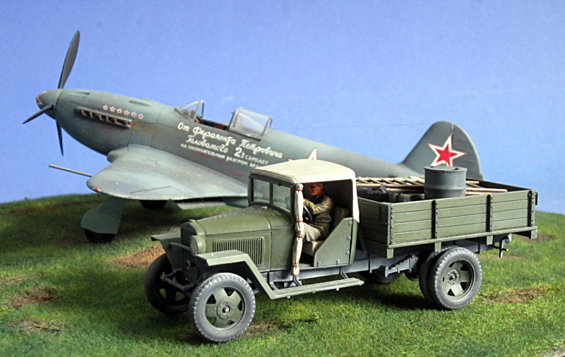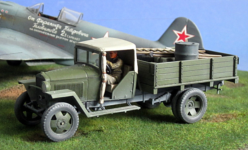 Die Farbgebung erfolgte schon vor der Endmontage, so kam ich überall gut heran und brauchte nichts abkleben. Das 4BO (grün) stammt von Vallejo, der Rest sind Tamiya und Gunze Farben. Gealtert wurde mit verschiedenen Washes und Filtern von Mig und Ak47. Alles recht dezent, denn das fertige Fahrzeug sollte auf einem relativ trockenen Flugplatz eingesetzt sein, damit ich es als Beiwerk für meine sowjetischen Weltkriegsflugzeuge verwenden kann. Daher musste auch der Fahrer hinein, allerdings ist nicht viel von dem Genossen zu sehen... zum Glück.