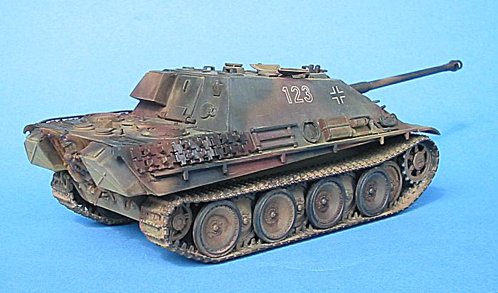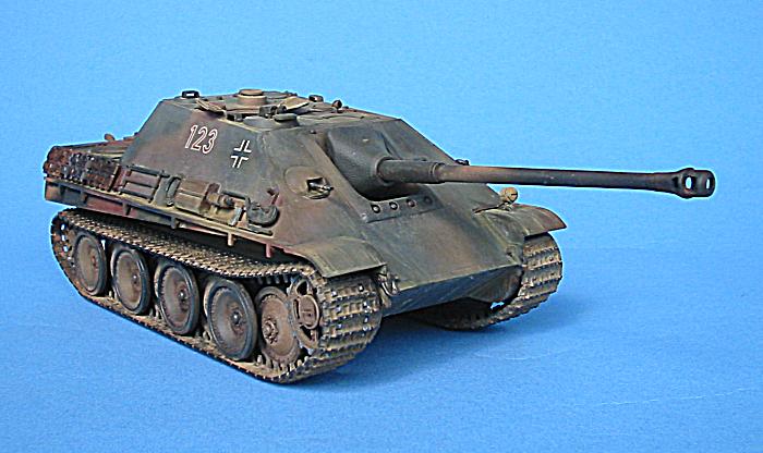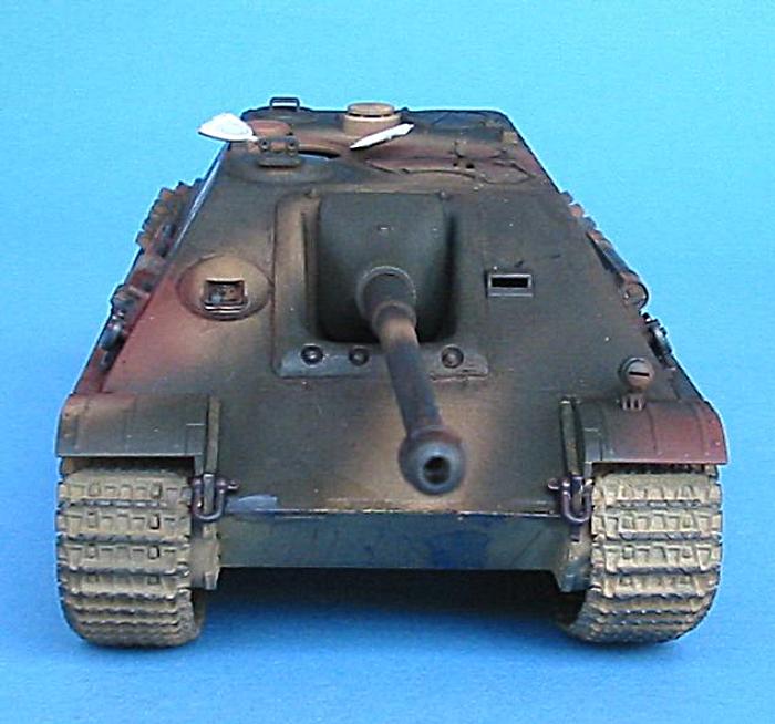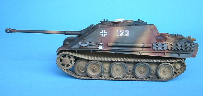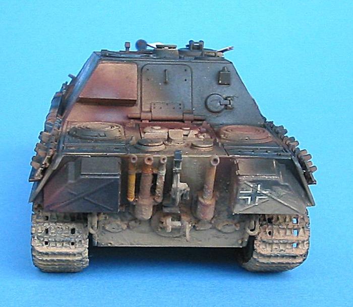 Nun zu meinem Sonderwunsch. Ich beginne gerade erst mich für die bodenständigen Truppen zu interessieren, also stehen mir noch keine weitreichenden Unterlagen zur Verfügung. Also frug ich Mathias Hädler, ob er nicht einen Jagdpanther mit bekannter Besatzung kenne. Daraufhin sandte er mir einige Fotos eines Jagdpanthers der sPzAbt. 654 der möglicherweise von Helmut Ritgen kommandiert wurde. Dieser Jagdpanther hat zusätzlich zu den Heckstaukisten noch eine an der Rückseite des Kasemattenaufbaus. Dazu hat mir Mathias auch ein Teil eines 1/35 Kits als Vorlage gegeben. Nochmals Vielen Dank!!!
