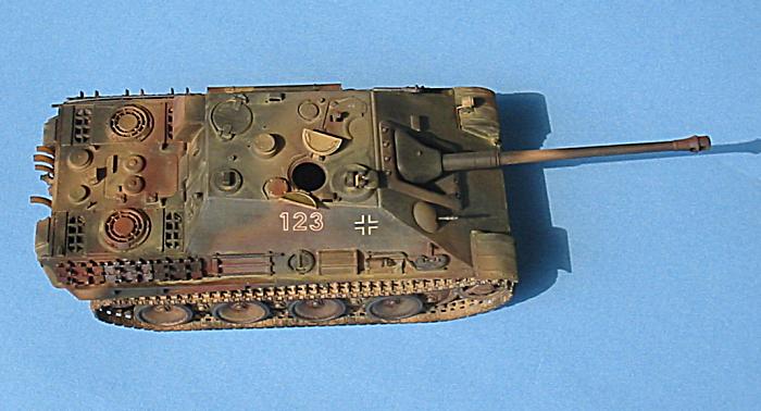Dieses Teil habe ich mittels plastic sheet nachgebildet. Auf den Bildern ist zu erkennen, dass das Fahrzeug nicht den im Bausatz enthaltenen wulstigen Kragen um das Geschütz hat, sondern die frühe etwas glattere Ausführung. Diese habe ich versucht mittels Motortool nachzubilden (natürlich nicht perfekt). Als weitere Einzelheiten, habe ich die frühe Auspuffanlage und den einfachen linken Lüfter angebracht.