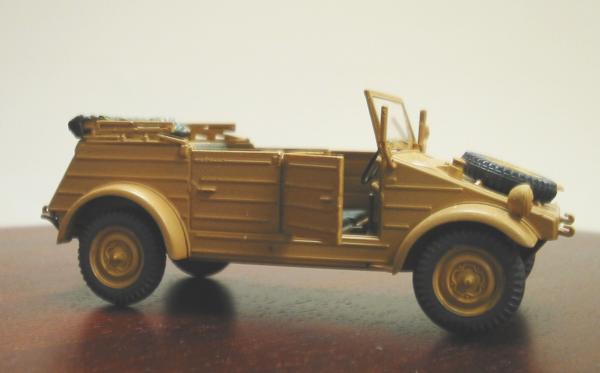Das Verdeck kann zwar nur offen dargestellt werden, dafür können die beiden vorderen Türen geöffnet werden. Alle Teile sind fein detailliert und sauber ausgeformt. Der Zusammenbau bereitet keine Probleme und in wenigen Stunden hat man eine schöne Replik des VWKübels vor sich stehen.