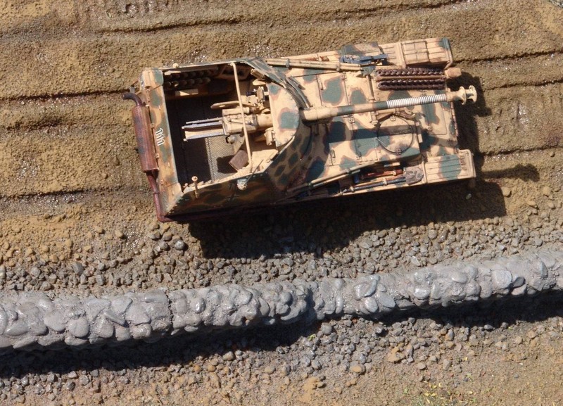 Nach dem Mattlack sieht das Ganze schon freundlicher aus. Zuvor brachte ich aber die Decals auf und versiegelte sie. Die Hervorhebung der Strukturen erfolgte durch Washes (Devlan Mud und Badab Black von Citadel/GW). Dazu habe ich noch „Regenstreifen“ mit Ölfarben aufgebracht und verschieden Pigmente von MIG für die Simulation von Staub und getrocknetem Modder benutzt. Hier war ich etwas übereifrig und habe ein paar kleine Stellen weniger gut behandelt .. na ja mir reicht es so, da ich hier wirklich nur Motivation tanken wollte. Einen Hitzeschild für den Auspufftopf imitierte ich mit Alufolie und einem Rändelrad (Tamiya sieht lediglich ein Abziehbild vor) und die Antenne ist aus Stahldraht .. vielleicht bastele ich irgendwann noch mal ein kleines Diorama drumherum, dann würde ich natürlich noch Gepäck, Ausrüstung und Munition ergänzen.