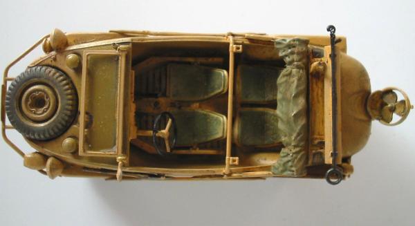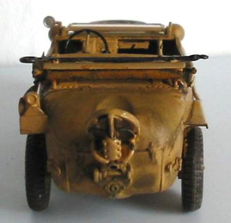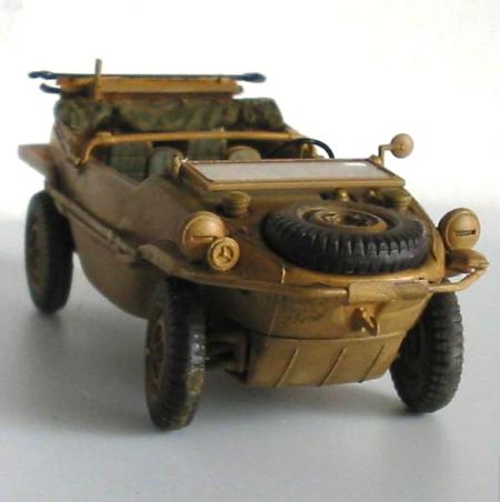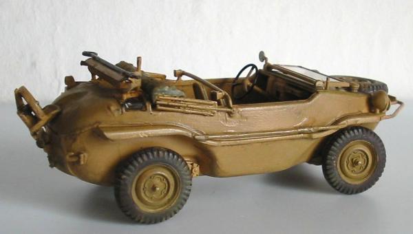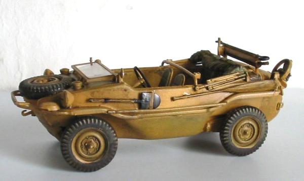 Vorbild: Ich bin noch neu im Militärmodellbau und habe deshalb leider auch nur eine sehr schmale Literaturbasis. Trotzdem möchte ich kurz einen historischen Abriss über den "Schwimmkübel" geben. Auf Basis des KdF-Wagens entstand Ende der 30er Jahre des 20. Jahrhunderts ein leichtes, geländegängiges Fahrzeug, der "Kübel" (Kfz. 2). Aufgrund der Erfahrungen aus dem Frankreichfeldzug forderte das Heereswaffenamt die Entwicklung einer schwimmfähigen Version dieses Fahrzeugs. Der Nachweis der Machbarkeit eines solchen Vorhabens war schon durch den Ingenieur Trippel mit dem Fahrzeug SG 6 erbracht worden. So entstand zunächst der Typ 128, der sich in den Vergleichsfahrten gegen den Trippelwagen und den Einheitskübel (Kfz.1) durchsetzte.