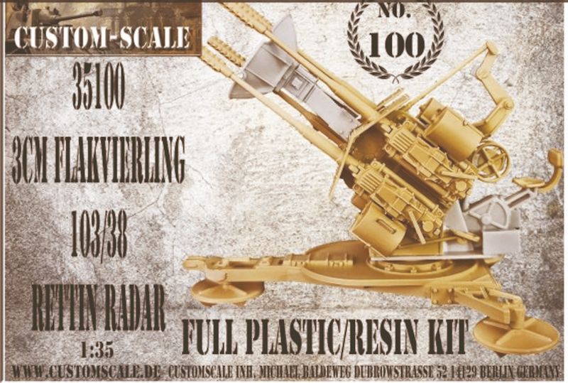 Bausatz: Der Kleinserien Hersteller Custom-Scale, der bereits bei einigen Bausätzen mit der Firma "Das Werk" zusammengearbeitet hat, greift die Idee im Sinne eines "What if" Bausatzes auf und bietet nun als Bausatz 100 die Spritzgussteile der 3cm Vierlingsflak zusammen mit Umbauteilen für die 3cm Rettin Flak im Maßstab 1:35 an.