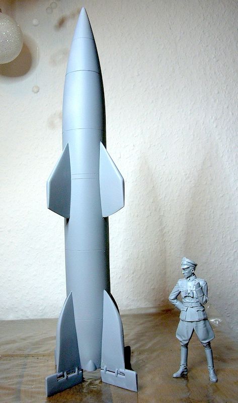 Die Zeichnung wurde mehrfach abgeändert, bis schließlich grünes Licht auf beiden Seiten gegeben werden konnte und anschließend der Formenbau begann, wobei der Aufwand und Materialbedarf an Silikon und Resin erheblich ist. Nach Erhalt der Resinteile habe ich diese zusammen geklebt, die Klebestellen verspachtelt und in mehrstündigen Schleiforgien geglättet. Anschließend erhielt das Raketenmodell mit feiner Tamiya Grundierung aus der Sprühdose eine erste Grundierung. Auf dem Foto ist erst bei direktem Vergleich mit einer entsprechenden Figur erkennbar, dass das insgesamt riesige Modell im original doch relativ klein war.
