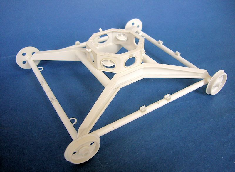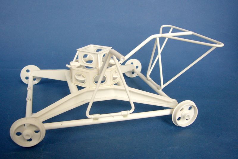 Der Startwagen: Wie bereits erwähnt, findet man zur Ausführung Wasserfall C2 W10 nur begrenzt Informationen. Dies betrifft insbesondere den entsprechenden Startwagen. Für die Ausführungen C2 W1 und C2 W5 habe ich freundlicherweise von einem Bastelfreund Kopien von originalen Blaupausen erhalten, die mein Herz höher schlagen ließen. Für die C2 W10 allerdings lag mir absolut keine Info vor. Aus diesem Grund habe ich mich dazu entschlossen, kreativ damaliges Vorgehen zu interpretieren. Ausgehend davon, dass bereits einige Startwagen für die C2 W5 existierten, musste nur noch ein entsprechender Adapter für die kleinere Rakete konstruiert und aufgesetzt werden. In diesem Fall habe ich auf das Angebot von Lukas verzichtet, die Teile im 3D Druck herzustellen, da ich möglichst alle Details auf Basis der Blaupausen auch im Modell umsetzen wollte. Nach Erstellung der Maßstabszeichnungen in 1:16 ging es an den Bau in herkömmlicher und bewährter Weise. Mittels Plastikprofilen habe ich zunächst den Rohrrahmen und das Mittelstück des "Startwagens S" gebaut. Im nächsten Schritt folgte der Bau des achteckigen Aufbaus, auf dem im Original die C2 W5 befestigt war. Besonders gelungen finde ich die Ergänzung der Handräder in den ovalen Öffnungen, mit dessen Hilfe die Rakete mit dem Startwagen verschraubt werden konnte, was für den Transport und das Aufstellen wichtig war. Kurz vor dem Start wurden die Schrauben gelöst. Im nächsten Schritt habe ich noch die Scharniere für die Anschubhilfen und deren Verbindungselemente am achteckigen Aufbau ergänzt und die vier "Eisenbahn" Räder angefertigt.