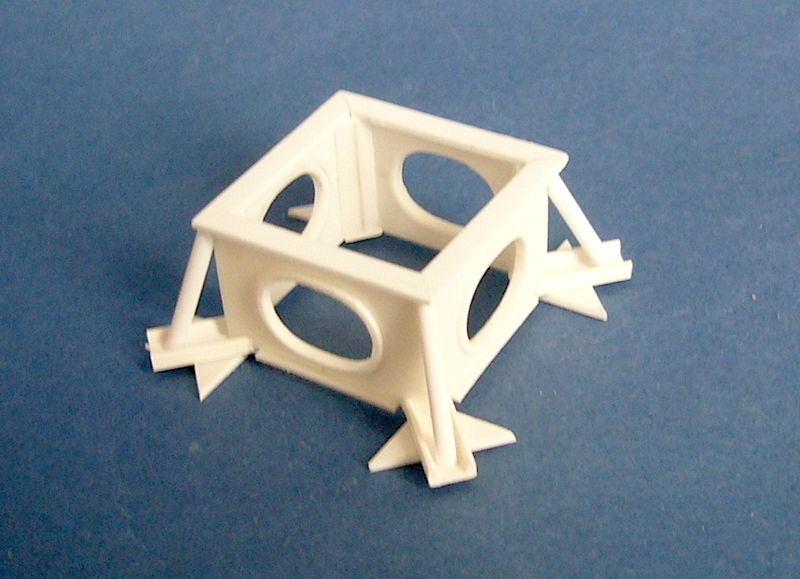 Der Startwagen: Für die Konstruktion des Zwischenstückes habe ich mehre Tage benötigt und das erste Konzept nach Bau verworfen. Letztendlich habe ich mich dann für eine Ausführung entschieden, die wesentliche Elemente des unteren Segmentes wiederholt und das Teil aber so gestaltet ist, dass es zum einen einfach auf dem Startwagen S aufgesetzt und wieder entfernt werden kann und zu anderen auch eine ausreichende Stabilität aufweist um die Rakete im Modell sowie im Original tragen zu können.