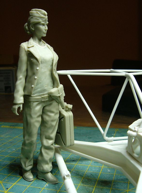 Auf jeden Fall will ich daraus noch eine Vignette mit passender Figur bauen und den Starttisch auf zwei Schienen positionieren. Die ursprünglich dafür vorgesehene Figur fand ich dann aber zu langweilig und habe mir eine etwas freizügige Soldatin im InterNet bestellt, die einen Kick in das Thema bringt. Damit dies dann aber wieder stimmiger wird, und zum Thema Wehrmacht 46 passt, erhielt die Lady noch ein T-Shirt aus Magic Sculpt unter der Jacke.
