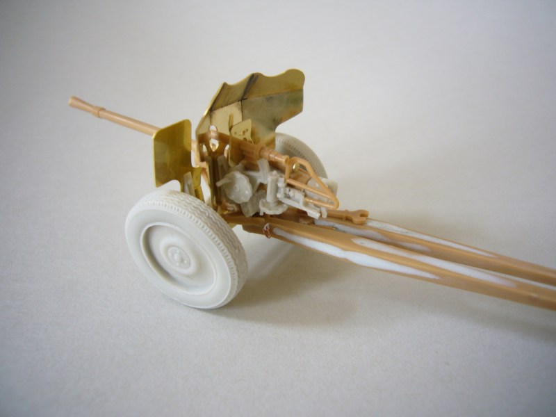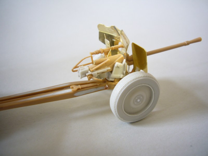 Im vorletzten Schritt sollten die beiden Holme der Spreizlafette noch mit Kleinteilen versehen und mit der Rohrwiege verbunden werden. Auch hier galt es zunächst unzählige Sinkstellen mit Putty zu verschließen und die Teile danach durch vorsichtiges Schleifen in die richtige Form zu bringen. Die sehr schön und fein profilierten Resin Reifen kann man erst durch vorsichtiges Nachbohren der Löcher in den Naben an der Achse befestigen.