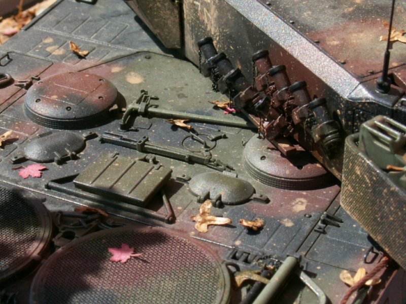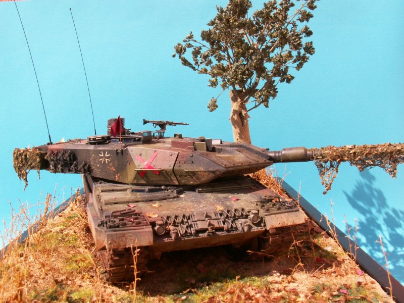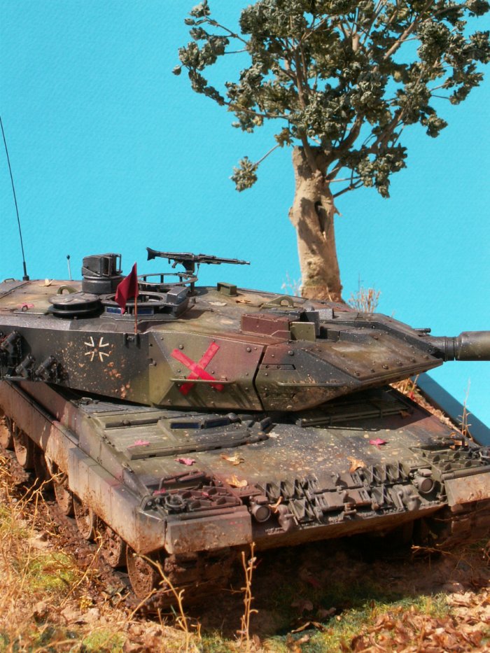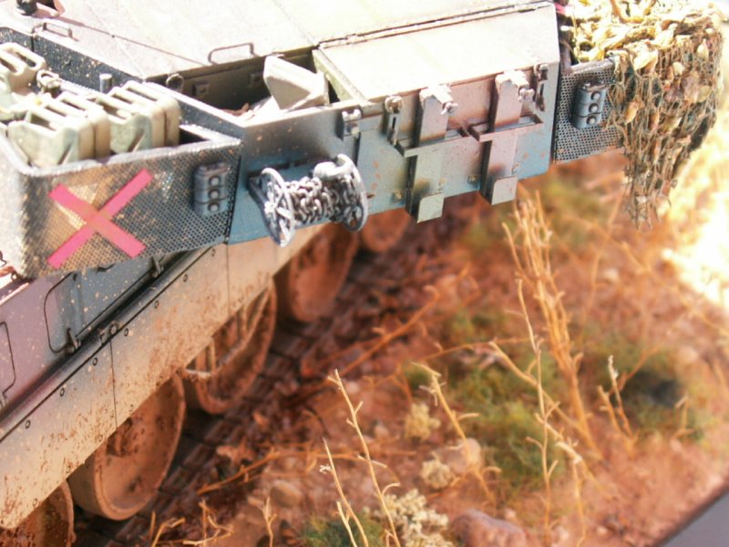 Das Modell ist von Tamiya und wurde mit dem Voyager Set verfeinert. Die Farbgebung erfolgte mit Acrylfarben von Tamiya. Darauf folgten Washing und Filter mit Ölfarben und MIG Pigmenten. Für den Schlamm wurde dieselbe Mixtur mit Gips und "echtem" Sand gemischt. Der Baum ist ein abgestorbener Bonsai (möge er in Frieden ruhen), welcher mit Oreganozweigen belebt wurde. Mittels Airbrush wurde das Bäumchen dann eingefärbt.